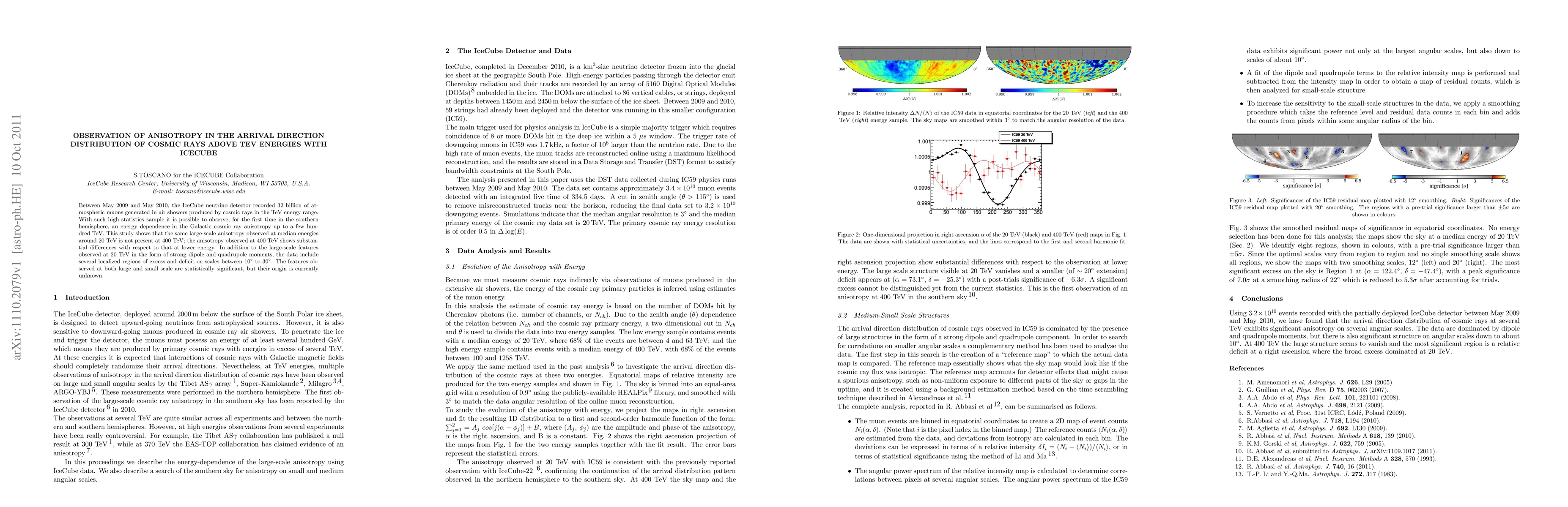 The IceCube detector observed an energy-dependent anisotropy in the arrival direction distribution of TeV cosmic rays, revealing significant differences in anisotropy at 400 TeV compared to lower energies, with notable large-scale dipole and quadrupole moments and localized regions of excess and deficit. The origin of these features remains unidentified.