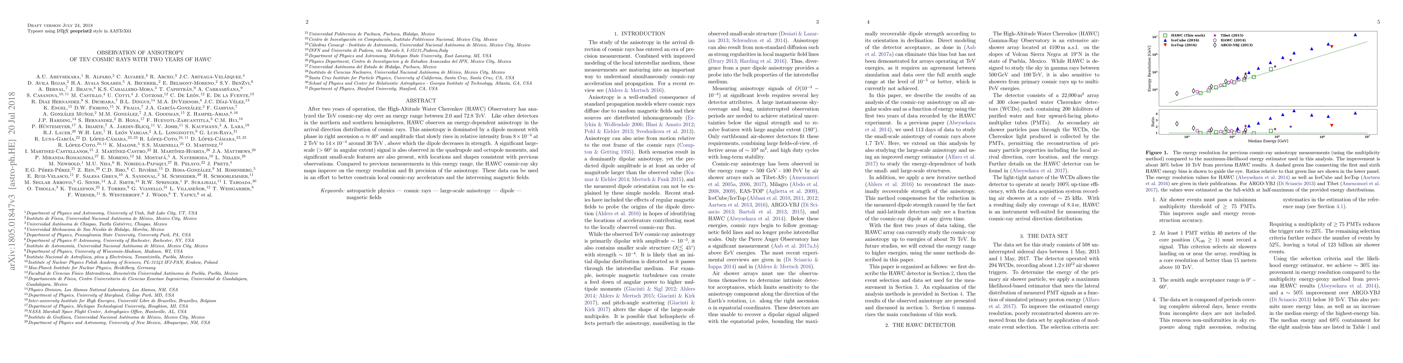 The HAWC Observatory has observed an energy-dependent anisotropy in TeV cosmic rays over two years of operation, showing a dipole moment with increasing amplitude up to 30.3 TeV. The data also reveal significant large-scale anisotropy in higher-order moments and small-scale features consistent with previous observations.