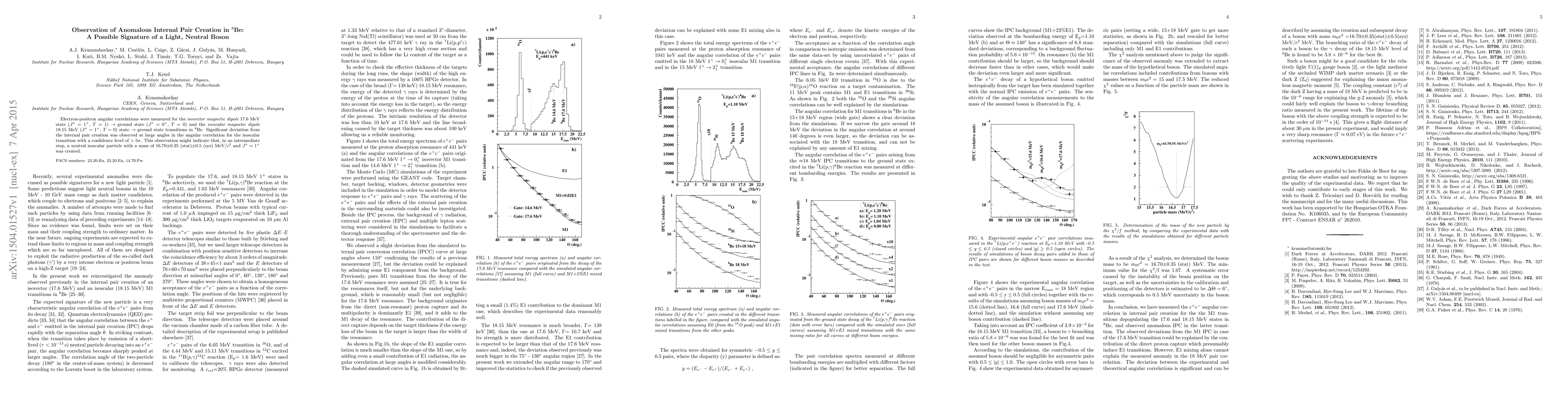 Electron-positron angular correlations were measured for the isovector magnetic dipole 17.6 MeV state ($J^\pi=1^+$, $T=1$) $\rightarrow$ ground state ($J^\pi=0^+$, $T=0$) and the isoscalar magnetic dipole 18.15 MeV ($J^\pi=1^+$, $T=0$) state $\rightarrow$ ground state transitions in $^{8}$Be. Significant deviation from the internal pair creation was observed at large angles in the angular correlation for the isoscalar transition with a confidence level of $> 5\sigma$. This observation might indicate that, in an intermediate step, a neutral isoscalar particle with a mass of 16.70$\pm0.35 $ (stat)$\pm 0.5 $ (sys) MeV$/c^2$ and $J^\pi = 1^+$ was created.