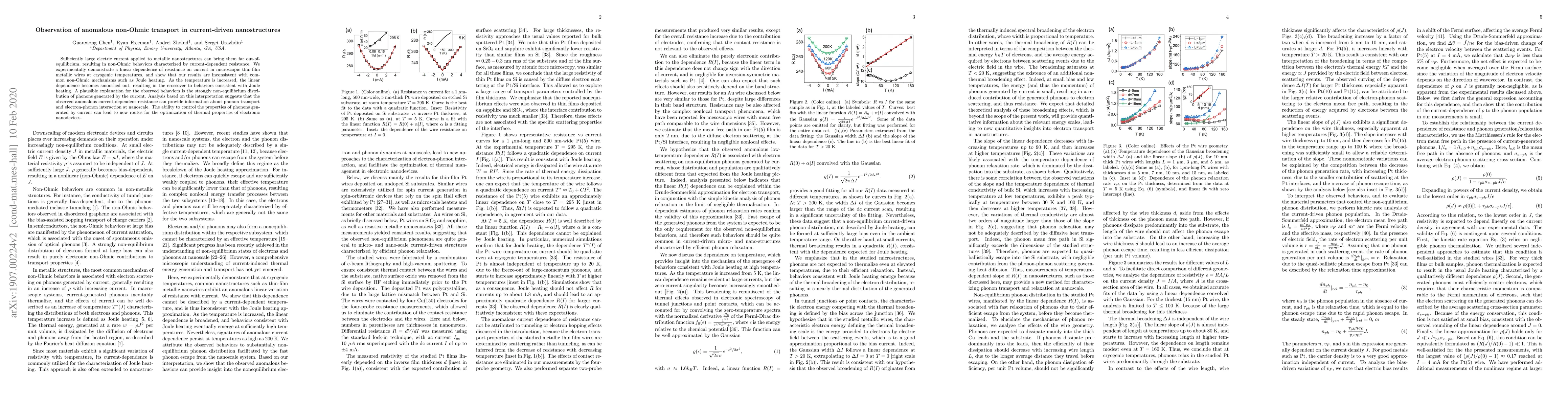 This paper reports on the observation of anomalous non-Ohmic transport in metallic nanostructures driven by large electric currents, demonstrating a linear current-resistance relationship at cryogenic temperatures that deviates from Joule heating. The observed behavior suggests a non-equilibrium phonon distribution, offering insights into phonon transport and electron-phonon interactions at the nanoscale.