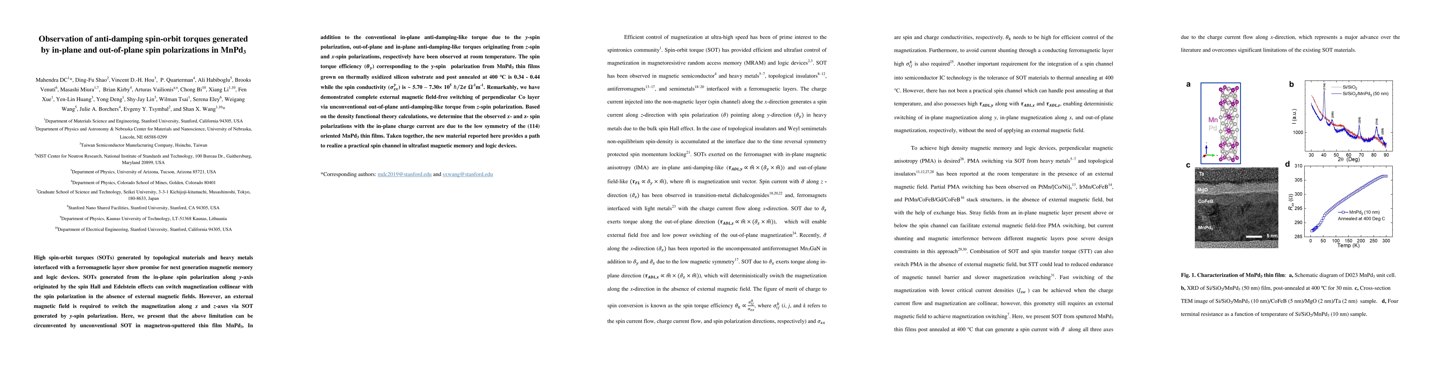 High spin-orbit torques (SOTs) generated by topological materials and heavy metals interfaced with a ferromagnetic layer show promise for next generation magnetic memory and logic devices. SOTs generated from the in-plane spin polarization along y-axis originated by the spin Hall and Edelstein effects can switch magnetization collinear with the spin polarization in the absence of external magnetic fields. However, an external magnetic field is required to switch the magnetization along x and z-axes via SOT generated by y-spin polarization. Here, we present that the above limitation can be circumvented by unconventional SOT in magnetron-sputtered thin film MnPd3. In addition to the conventional in-plane anti-damping-like torque due to the y-spin polarization, out-of-plane and in-plane anti-damping-like torques originating from z-spin and x-spin polarizations, respectively have been observed at room temperature. The spin torque efficiency corresponding to the y-spin polarization from MnPd3 thin films grown on thermally oxidized silicon substrate and post annealed at 400 Deg C is 0.34 - 0.44. Remarkably, we have demonstrated complete external magnetic field-free switching of perpendicular Co layer via unconventional out-of-plane anti-damping-like torque from z-spin polarization. Based on the density functional theory calculations, we determine that the observed x- and z- spin polarizations with the in-plane charge current are due to the low symmetry of the (114) oriented MnPd3 thin films. Taken together, the new material reported here provides a path to realize a practical spin channel in ultrafast magnetic memory and logic devices.