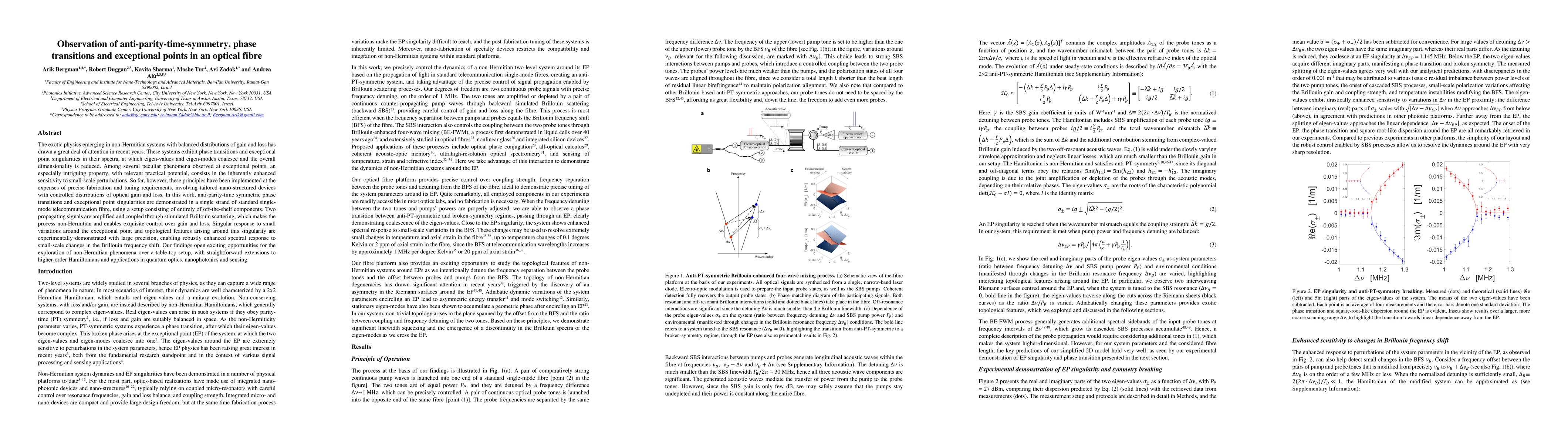 The exotic physics emerging in non-Hermitian systems with balanced distributions of gain and loss has drawn a great deal of attention in recent years. These systems exhibit phase transitions and exceptional point singularities in their spectra, at which eigen-values and eigen-modes coalesce and the overall dimensionality is reduced. Among several peculiar phenomena observed at exceptional points, an especially intriguing property, with relevant practical potential, consists in the inherently enhanced sensitivity to small-scale perturbations. So far, however, these principles have been implemented at the expenses of precise fabrication and tuning requirements, involving tailored nano-structured devices with controlled distributions of optical gain and loss. In this work, anti-parity-time symmetric phase transitions and exceptional point singularities are demonstrated in a single strand of standard single-mode telecommunication fibre, using a setup consisting of entirely of off-the-shelf components. Two propagating signals are amplified and coupled through stimulated Brillouin scattering, which makes the process non-Hermitian and enables exquisite control over gain and loss. Singular response to small variations around the exceptional point and topological features arising around this singularity are experimentally demonstrated with large precision, enabling robustly enhanced spectral response to small-scale changes in the Brillouin frequency shift. Our findings open exciting opportunities for the exploration of non-Hermitian phenomena over a table-top setup, with straightforward extensions to higher-order Hamiltonians and applications in quantum optics, nanophotonics and sensing.