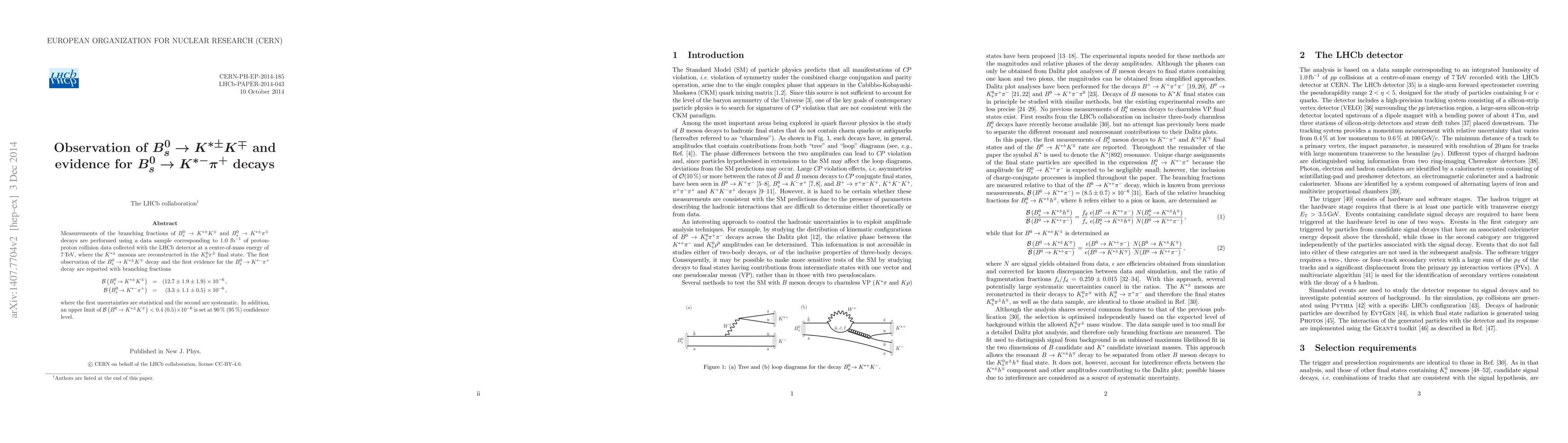 The paper reports the first observation of the $B^0_s \to K^{*\pm}K^\mp$ decay and evidence for the $B^0_s \to K^{*-}\pi^+$ decay, with branching fractions determined from LHCb data at 7 TeV. The observed branching fractions are $(12.7\pm1.9\pm1.9) \times 10^{-6}$ and $(3.3\pm1.1\pm0.5) \times 10^{-6}$, respectively.