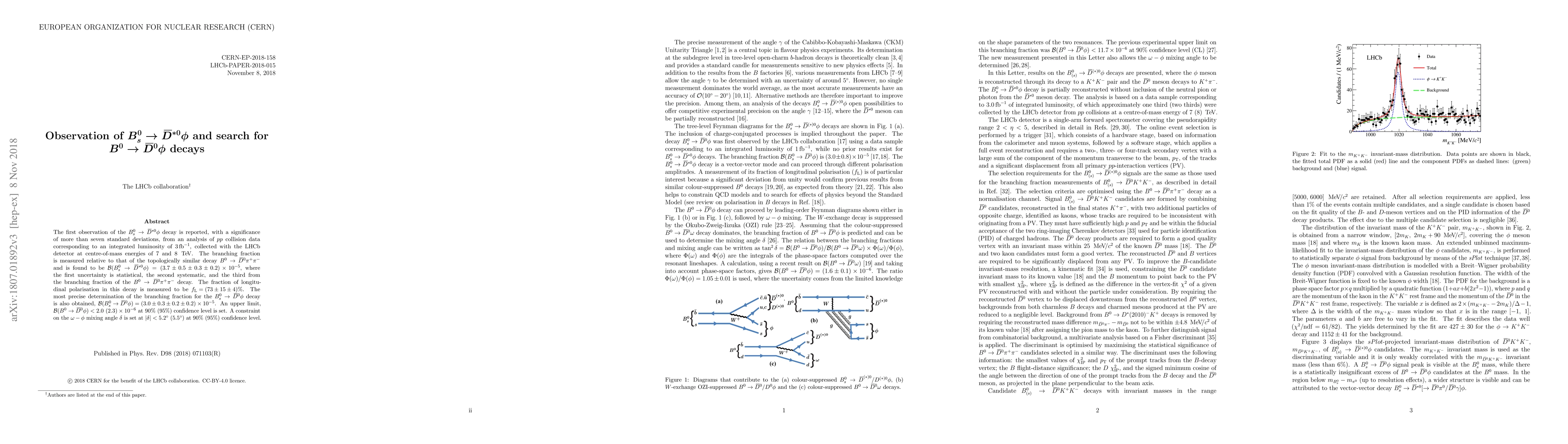The first observation of the $B_s^0 \to \overline{D}^{*0} \phi$ decay is reported, with a significance of more than seven standard deviations, from an analysis of $pp$ collision data corresponding to an integrated luminosity of 3 fb$^{-1}$, collected with the LHCb detector at centre-of-mass energies of $7$ and $8$ TeV. The branching fraction is measured relative to that of the topologically similar decay $B^0 \to \overline{D}^0 \pi^+\pi^-$ and is found to be $\mathcal{B}(B_s^0 \to \overline{D}^{*0} \phi) = (3.7 \pm 0.5 \pm 0.3 \pm 0.2) \times 10^{-5}$, where the first uncertainty is statistical, the second systematic, and the third from the branching fraction of the $B^0 \to \overline{D}^0 \pi^+\pi^-$ decay. The fraction of longitudinal polarisation in this decay is measured to be ${f_{\rm L} =(73 \pm 15 \pm 3)\%}$. The most precise determination of the branching fraction for the $B_s^0 \to \overline{D}^{0} \phi$ decay is also obtained, $\mathcal{B}(B_s^0 \to \overline{D}^{0} \phi) = (3.0 \pm 0.3 \pm 0.2 \pm 0.2) \times 10^{-5}$. An upper limit, $\mathcal{B}(B^0 \to \overline{D}^{0} \phi) < 2.0 \ (2.2) \times 10^{-6}$ at $90\%$ (95\%) confidence level is set. A constraint on the $\omega-\phi$ mixing angle $\delta$ is set at $|\delta| < 5.2^\circ~ (5.5^\circ)$ at $90\%$ ($95\%$) confidence level.