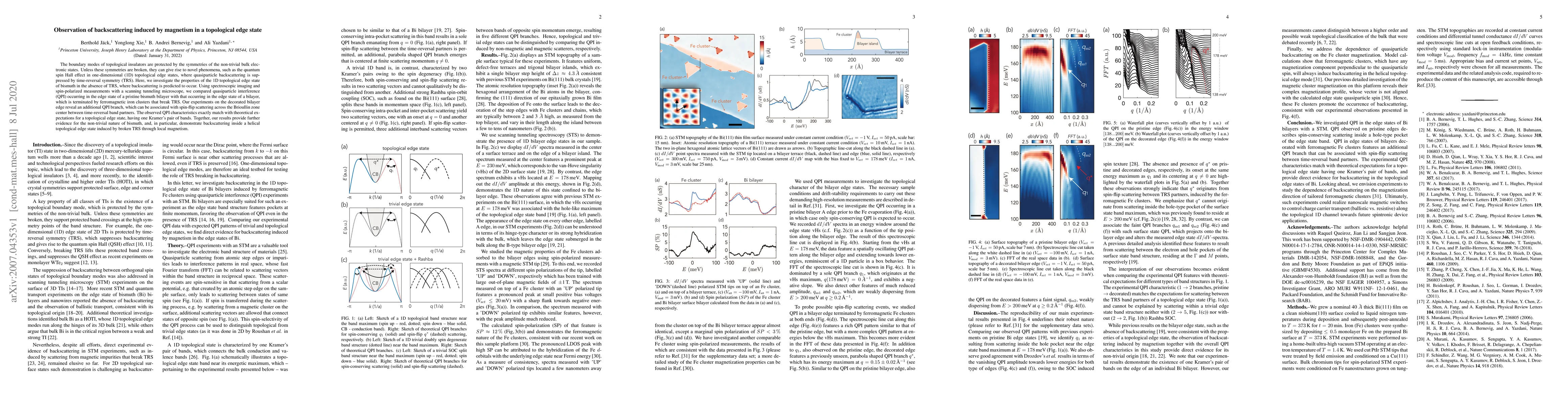 This paper investigates the impact of broken time-reversal symmetry on the topological edge state of bismuth, revealing enhanced quasiparticle interference indicative of spin-flip backscattering due to ferromagnetic iron clusters. The findings confirm the non-trivial topological properties of bismuth and demonstrate magnetism-induced backscattering in helical edge states.