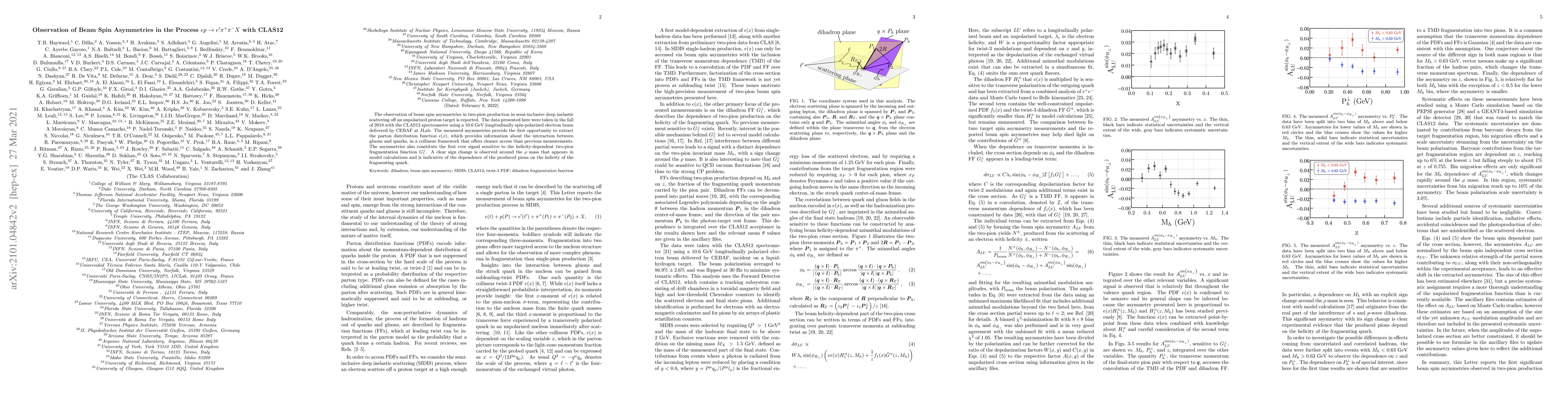 The observation of beam spin asymmetries in two-pion production in semi-inclusive deep inelastic scattering off an unpolarized proton target is reported. The data presented here were taken in the fall of 2018 with the CLAS12 spectrometer using a 10.6 GeV longitudinally spin-polarized electron beam delivered by CEBAF at JLab. The measured asymmetries provide the first opportunity to extract the parton distribution function $e(x)$, which provides information about the interaction between gluons and quarks, in a collinear framework that offers cleaner access than previous measurements. The asymmetries also constitute the first ever signal sensitive to the helicity-dependent two-pion fragmentation function $G_1^\perp$. A clear sign change is observed around the $\rho$ mass that appears in model calculations and is indicative of the dependence of the produced pions on the helicity of the fragmenting quark.