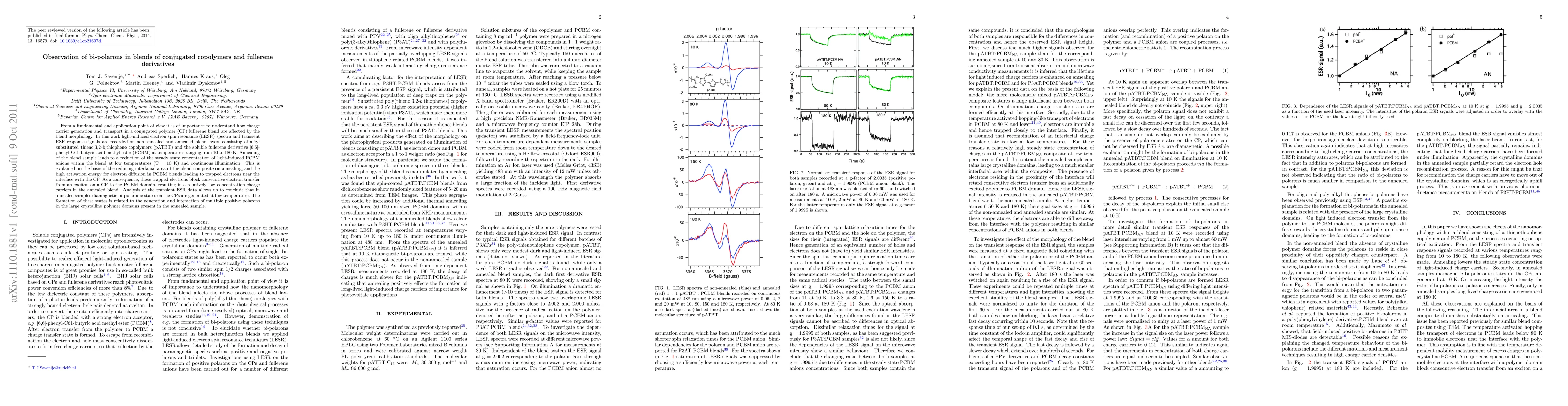 From a fundamental and application point of view it is of importance to understand how charge carrier generation and transport in a conjugated polymer (CP):fullerene blend are affected by the blend morphology. In this work light-induced electron spin resonance (LESR) spectra and transient ESR response signals are recorded on non-annealed and annealed blend layers consisting of alkyl substituted thieno[3,2-b]thiophene copolymers (pATBT) and the soluble fullerene derivative [6,6]-phenyl-C61-butyric acid methyl ester (PCBM) at temperatures ranging from 10 to 180 K. Annealing of the blend sample leads to a reduction of the steady state concentration of light-induced PCBM anions within the blend at low temperatures (T = 10 K) and continuous illumination. This is explained on the basis of the reducing interfacial area of the blend composite on annealing, and the high activation energy for electron diffusion in PCBM blends leading to trapped electrons near the interface with the CP. As a consequence, these trapped electrons block consecutive electron transfer from an exciton on a CP to the PCBM domain, resulting in a relatively low concentration charge carriers in the annealed blend. Analysis of the transient ESR data allows us to conclude that in annealed samples diamagnetic bi-polaronic states on the CPs are generated at low temperature. The formation of these states is related to the generation and interaction of multiple positive polarons in the large crystalline polymer domains present in the annealed sample.