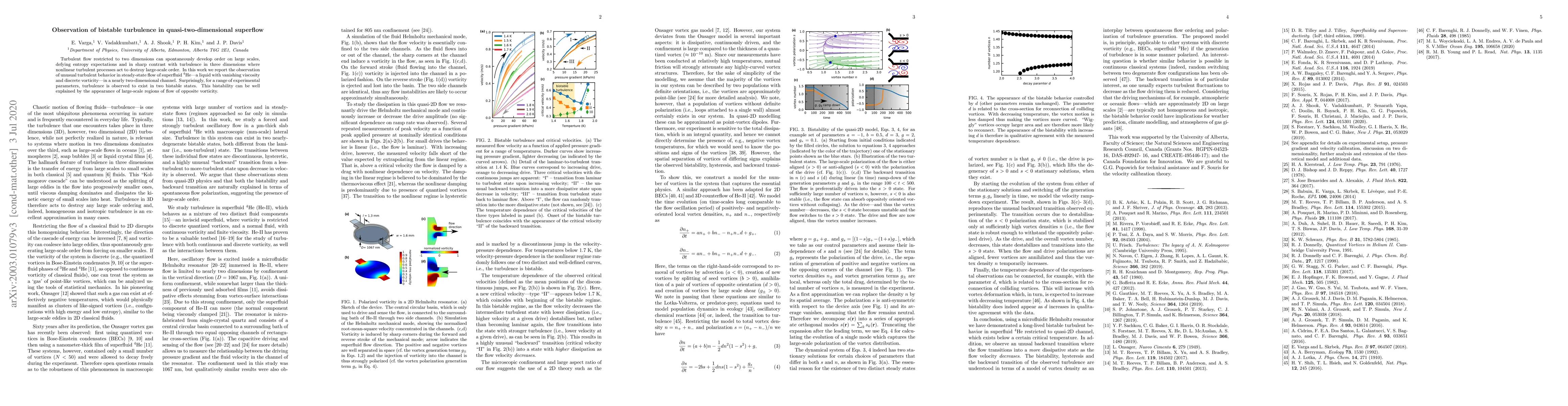 Turbulent flow restricted to two dimensions can spontaneously develop order on large scales, defying entropy expectations and in sharp contrast with turbulence in three dimensions where nonlinear turbulent processes act to destroy large-scale order. In this work we report the observation of unusual turbulent behavior in steady-state flow of superfluid \4He---a liquid with vanishing viscosity and discrete vorticity---in a nearly two-dimensional channel. Surprisingly, for a range of experimental parameters, turbulence is observed to exist in two bistable states. This bistability can be well explained by the appearance of large-scale regions of flow of opposite vorticity.