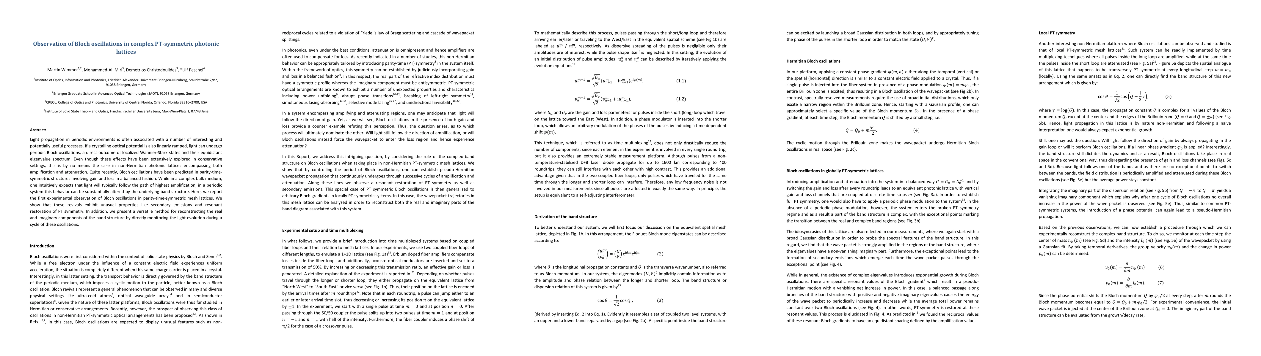 This paper reports the first experimental observation of Bloch oscillations in complex PT-symmetric photonic lattices, revealing unusual properties such as secondary emissions and resonant restoration of PT symmetry. The study also introduces a method to reconstruct the real and imaginary components of the band structure by monitoring light evolution during oscillations.