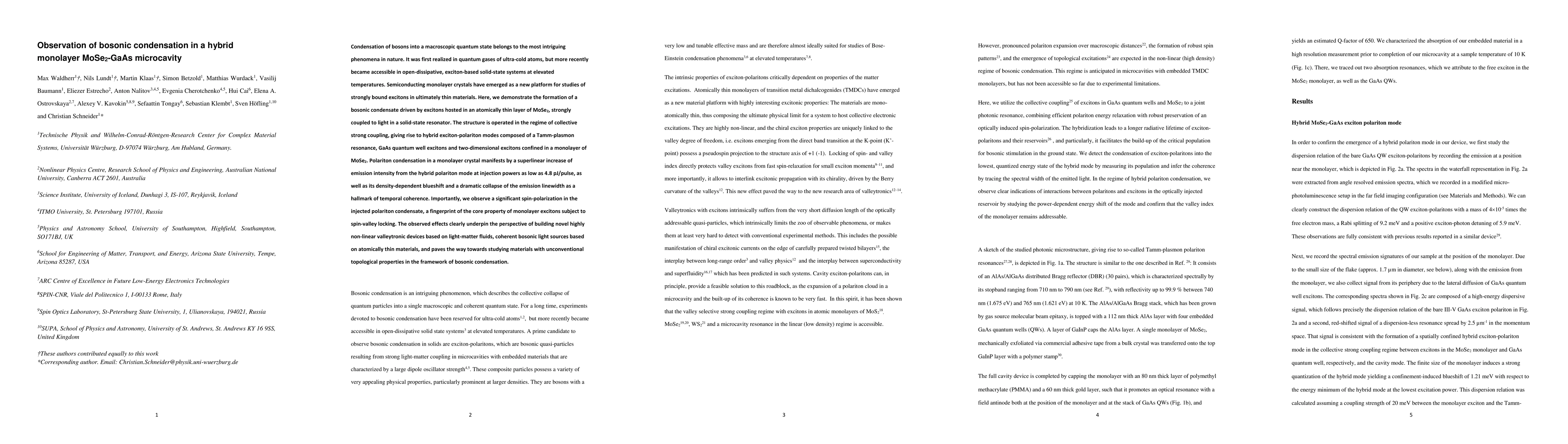 Condensation of bosons into a macroscopic quantum state belongs to the most intriguing phenomena in nature. It was first realized in quantum gases of ultra-cold atoms, but more recently became accessible in open-dissipative, exciton-based solid-state systems at elevated temperatures. Semiconducting monolayer crystals have emerged as a new platform for studies of strongly bound excitons in ultimately thin materials. Here, we demonstrate the formation of a bosonic condensate driven by excitons hosted in an atomically thin layer of MoSe2, strongly coupled to light in a solid-state resonator. The structure is operated in the regime of collective strong coupling, giving rise to hybrid exciton-polariton modes composed of a Tamm-plasmon resonance, GaAs quantum well excitons and two-dimensional excitons confined in a monolayer of MoSe2. Polariton condensation in a monolayer crystal manifests by a superlinear increase of emission intensity from the hybrid polariton mode at injection powers as low as 4.8 pJ/pulse, as well as its density-dependent blueshift and a dramatic collapse of the emission linewidth as a hallmark of temporal coherence. Importantly, we observe a significant spin-polarization in the injected polariton condensate, a fingerprint of the core property of monolayer excitons subject to spin-valley locking. The observed effects clearly underpin the perspective of building novel highly non-linear valleytronic devices based on light-matter fluids, coherent bosonic light sources based on atomically thin materials, and paves the way towards studying materials with unconventional topological properties in the framework of bosonic condensation.