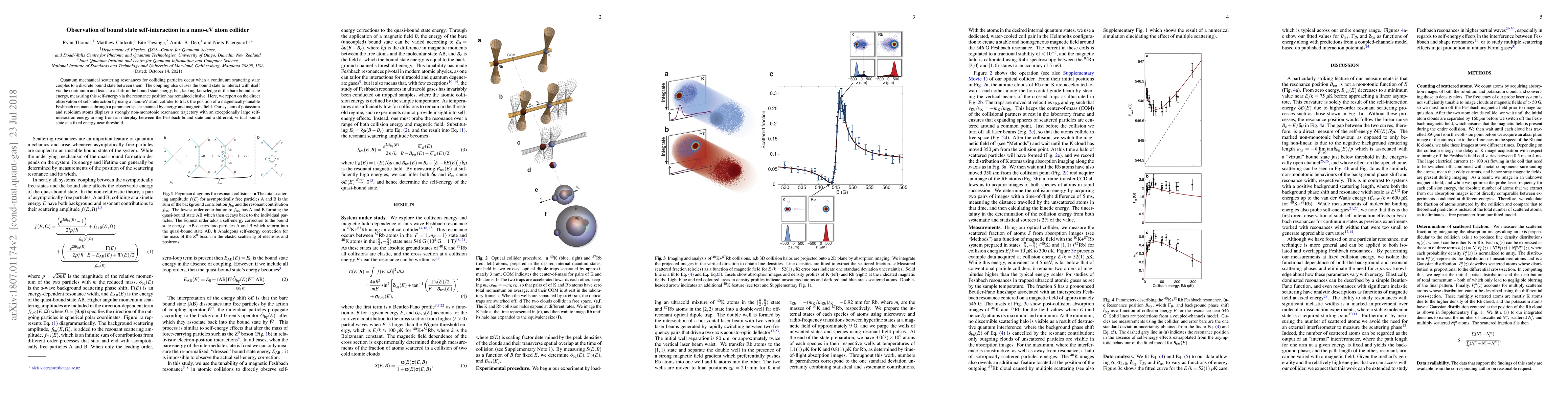 This paper reports the first direct observation of bound state self-interaction in a nano-eV atom collider, revealing a large self-interaction energy through a magnetically-tunable Feshbach resonance in potassium and rubidium atoms. The study uncovers a non-monotonic resonance trajectory influenced by both a Feshbach bound state and a virtual bound state.