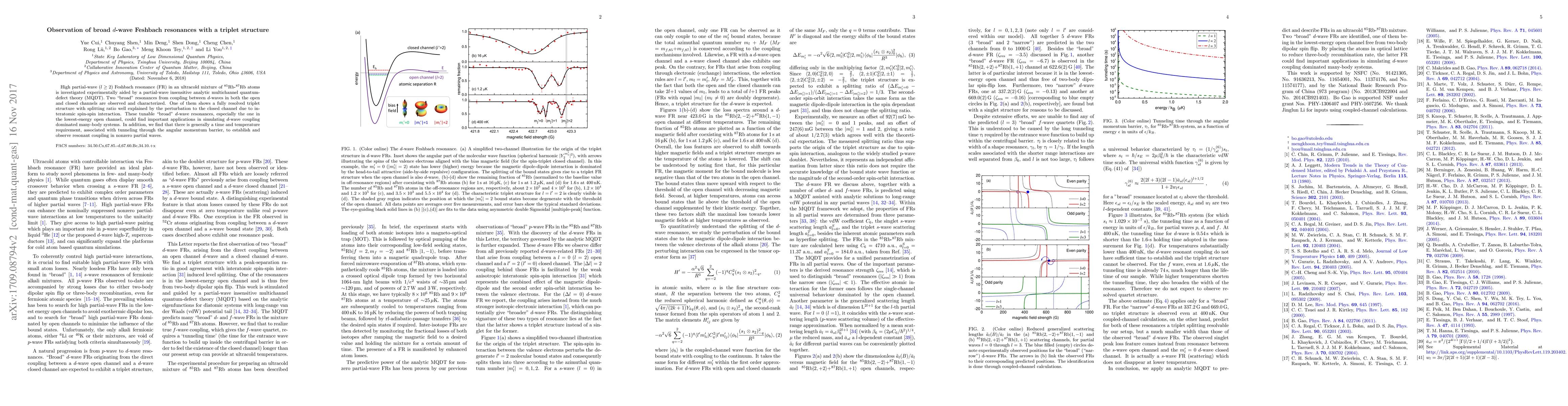 High partial-wave ($l\ge2$) Feshbach resonance (FR) in an ultracold mixture of $^{85}$Rb-$^{87}$Rb atoms is investigated experimentally aided by a partial-wave insensitive analytic multichannel quantum-defect theory (MQDT). Two "broad" resonances from coupling between d-waves in both the open and closed channels are observed and characterized. One of them shows a fully resolved triplet structure with splitting ratio well explained by the perturbation to the closed channel due to interatomic spin-spin interaction. These tunable "broad" d-wave resonances, especially the one in the lowest-energy open channel, could find important applications in simulating d-wave coupling dominated many-body systems. In addition, we find that there is generally a time and temperature requirement, associated with tunneling through the angular momentum barrier, to establish and observe resonant coupling in nonzero partial waves.