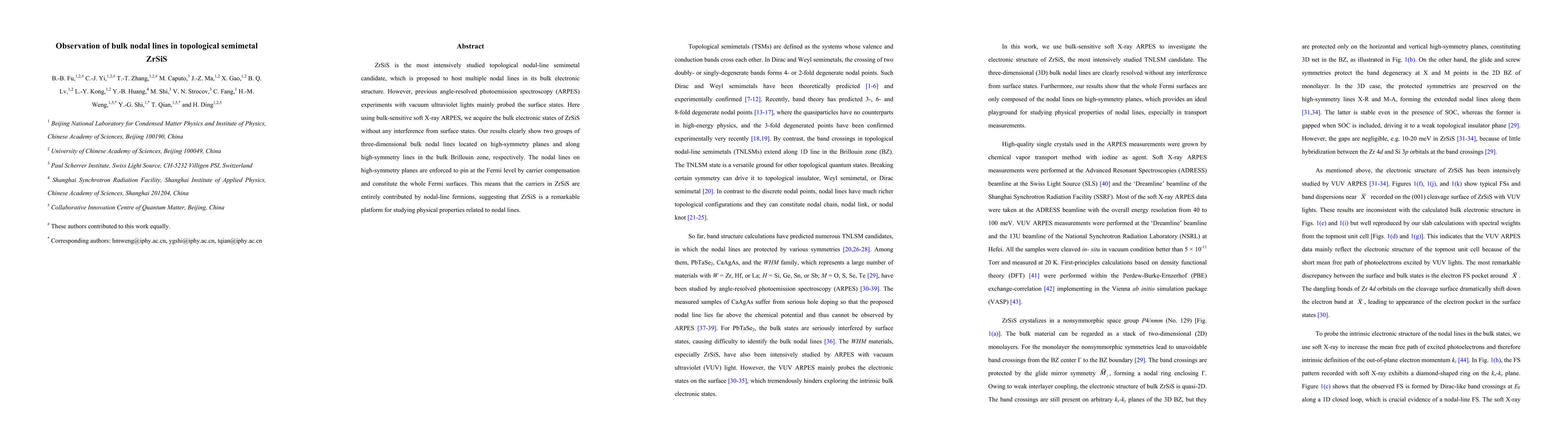 This study utilizes bulk-sensitive soft X-ray ARPES to reveal the bulk electronic states of the topological semimetal ZrSiS, identifying two groups of three-dimensional nodal lines. The nodal lines, pinned at the Fermi level, indicate that ZrSiS is a significant platform for exploring nodal-line fermion-related phenomena.