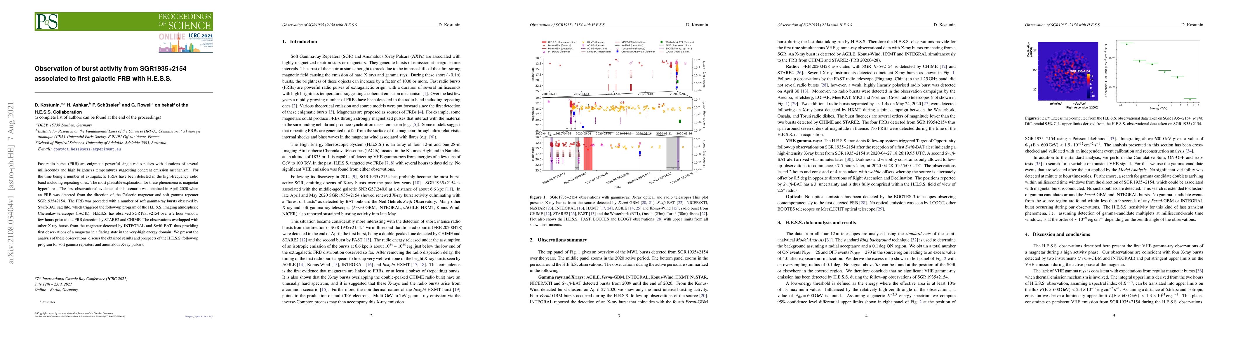 Fast radio bursts (FRB) are enigmatic powerful single radio pulses with durations of several milliseconds and high brightness temperatures suggesting coherent emission mechanism. For the time being a number of extragalactic FRBs have been detected in the high-frequency radio band including repeating ones. The most plausible explanation for these phenomena is magnetar hyperflares. The first observational evidence of this scenario was obtained in April 2020 when an FRB was detected from the direction of the Galactic magnetar and soft gamma repeater SGR1935+2154. The FRB was preceded with a number of soft gamma-ray bursts observed by Swift-BAT satellite, which triggered the follow-up program of the H.E.S.S. imaging atmospheric Cherenkov telescopes (IACTs). H.E.S.S. has observed SGR1935+2154 over a 2 hour window few hours prior to the FRB detection by STARE2 and CHIME. The observations overlapped with other X-ray bursts from the magnetar detected by INTEGRAL and Swift-BAT, thus providing first observations of a magnetar in a flaring state in the very-high energy domain. We present the analysis of these observations, discuss the obtained results and prospects of the H.E.S.S. follow-up program for soft gamma repeaters and anomalous X-ray pulsars.