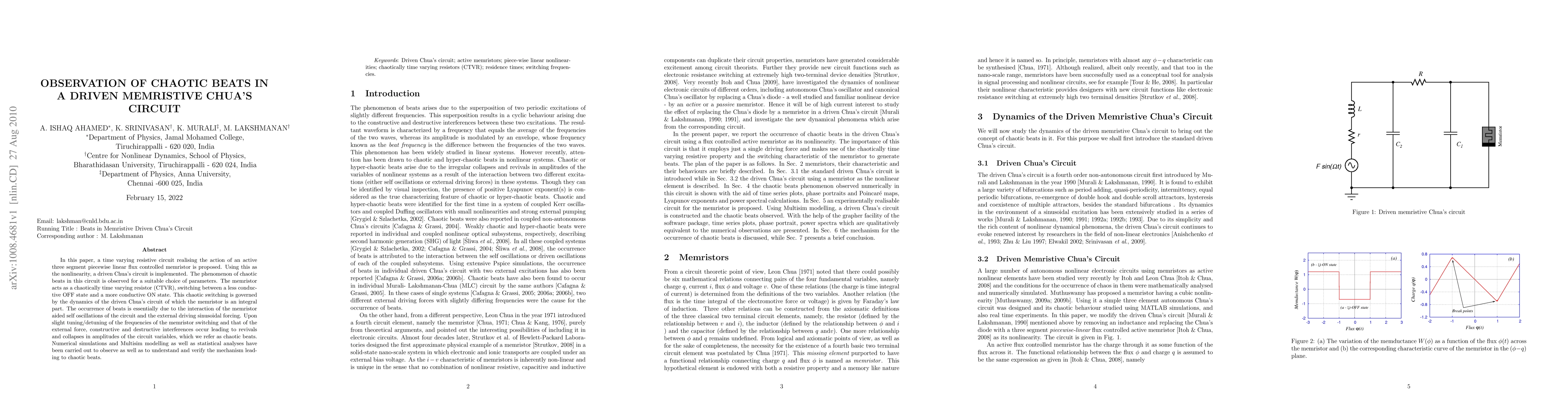 In this paper, a time varying resistive circuit realising the action of an active three segment piecewise linear flux controlled memristor is proposed. Using this as the nonlinearity, a driven Chua's circuit is implemented. The phenomenon of chaotic beats in this circuit is observed for a suitable choice of parameters. The memristor acts as a chaotically time varying resistor (CTVR), switching between a less conductive OFF state and a more conductive ON state. This chaotic switching is governed by the dynamics of the driven Chua's circuit of which the memristor is an integral part. The occurrence of beats is essentially due to the interaction of the memristor aided self oscillations of the circuit and the external driving sinusoidal forcing. Upon slight tuning/detuning of the frequencies of the memristor switching and that of the external force, constructive and destructive interferences occur leading to revivals and collapses in amplitudes of the circuit variables, which we refer as chaotic beats. Numerical simulations and Multisim modelling as well as statistical analyses have been carried out to observe as well as to understand and verify the mechanism leading to chaotic beats.