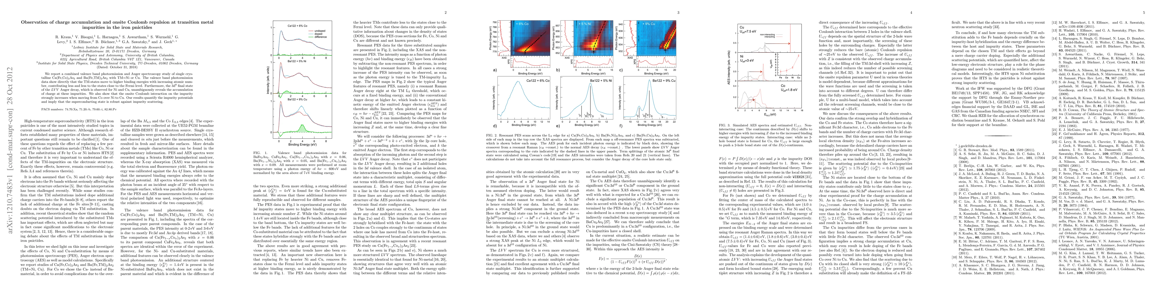 We report a combined valence band photoemission and Auger spectroscopy study of single crystalline Ca(Fe,Co)2As2 and Ba(Fe,TM)2As2 with TM=Ni or Cu. The valence band photoemission data show directly that the TM-states move to higher binding energies with increasing atomic number, contributing less and less to the states close to the Fermi level. Furthermore, the 3d8 final state of the LVV Auger decay, which is observed for Ni and Cu, unambiguously reveals the accumulation of charge at these impurities. We also show that the onsite Coulomb interaction on the impurity strongly increases when moving from Co over Ni to Cu. Our results quantify the impurity potentials and imply that the superconducting state is robust against impurity scattering.