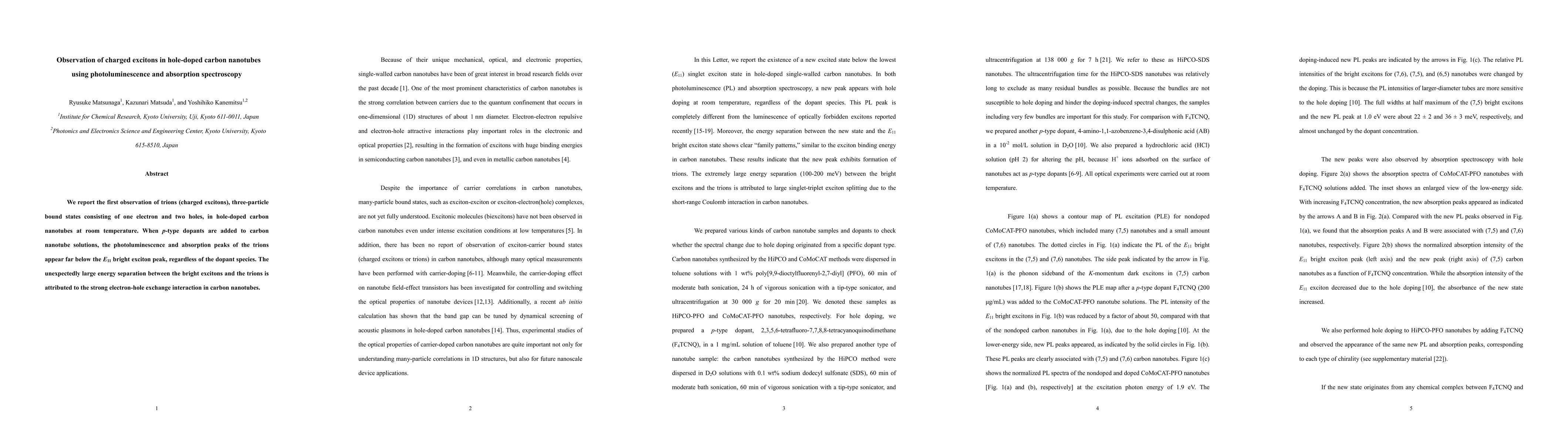 This research observes trions in hole-doped carbon nanotubes via photoluminescence and absorption spectroscopy, revealing a significant energy separation between trions and excitons due to strong electron-hole exchange interactions. The presence of p-type dopants induces these trions, which appear below the E11 bright exciton peak.