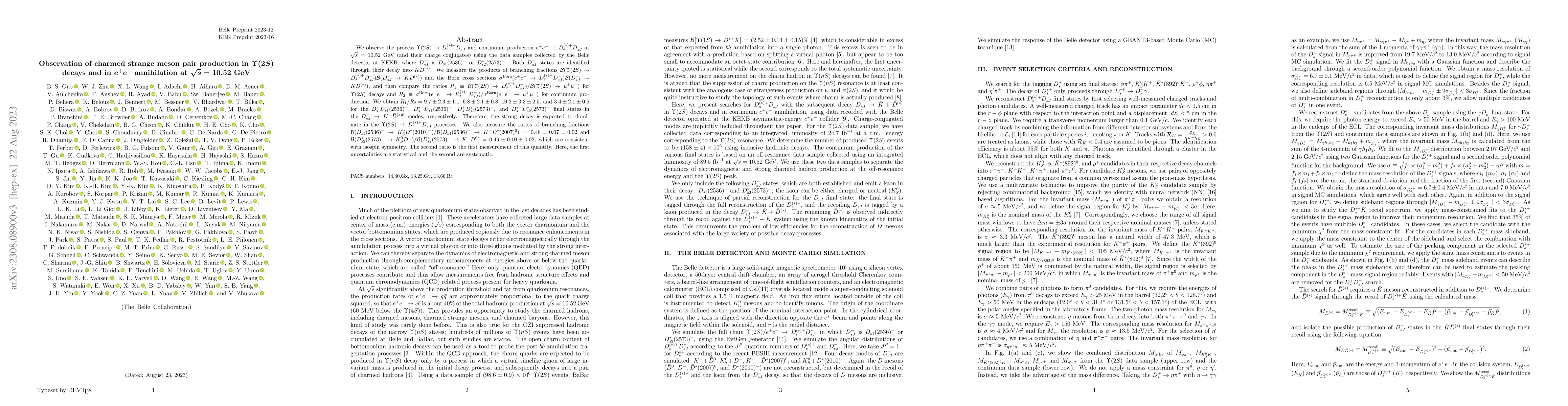 We observe the process $\Upsilon(2S)\to D_s^{(*)+} D_{sJ}^{-}$ and continuum production $e^+e^- \to D_s^{(*)+} D_{sJ}^- $ at $\sqrt{s} = 10.52$ GeV (and their charge conjugates) using the data samples collected by the Belle detector at KEKB, where $D_{sJ}^-$ is $D_{s1}(2536)^-$ or $D^{*}_{s2}(2573)^-$. Both $D_{sJ}^-$ states are identified through their decay into $\bar{K}\bar{D}^{(*)}$. We measure the products of branching fractions ${\cal B}(\Upsilon(2S) \to D_{s}^{(*)+} D_{sJ}^-) {\cal B}(D_{sJ}^-\to \bar{K} \bar{D}^{(*)})$ and the Born cross sections $\sigma^{\rm Born}(e^+e^- \to D_{s}^{(*)+} D_{sJ}^-) {\cal B}(D_{sJ}^-\to \bar{K} \bar{D}^{(*)})$, and then compare the ratios $R_1 \equiv {\cal B}(\Upsilon(2S)\to D_{s}^{(*)+} D_{sJ}^-)/{\cal B}(\Upsilon(2S)\to\mu^{+}\mu^-)$ for $\Upsilon(2S)$ decays and $R_2 \equiv \sigma^{\rm Born}(e^+e^-\to D_{s}^{(*)+}D_{sJ}^-)/\sigma^{\rm Born}(e^+e^-\to \mu^{+}\mu^-)$ for continuum production. We obtain $R_1/R_2 = 9.7\pm 2.3 \pm 1.1$, $6.8 \pm 2.1 \pm 0.8$, $10.2 \pm 3.3 \pm 2.5$, and $3.4 \pm 2.1 \pm 0.5$ for the $D_s^+ D_{s1}(2536)^-$, $D_s^{*+} D_{s1}(2536)^-$, $D_s^+ D_{s2}^{*}(2573)^{-}$, and $D_s^{*+} D_{s2}^{*}(2573)^{-}$ final states in the $D_{sJ}^-\to K^{-} \bar{D}^{(*)0}$ modes, respectively. Therefore, the strong decay is expected to dominate in the $\Upsilon(2S)\to D_{s}^{(*)+}D_{sJ}^-$ processes. We also measure the ratios of branching fractions ${\cal B}(D_{s1}(2536)^-\to K_S^0 D^{*}(2010)^{-})/{\cal B}(D_{s1}(2536)^-\to K^{-} D^{*}(2007)^0) = 0.48 \pm 0.07 \pm 0.02$ and ${\cal B}(D_{s2}^{*}(2573)^- \to K_S^0 D^-)/{\cal B}(D_{s2}^{*}(2573)^- \to K^{-}D^0) = 0.49 \pm 0.10 \pm 0.02$, which are consistent with isospin symmetry. The second ratio is the first measurement of this quantity. Here, the first uncertainties are statistical and the second are systematic.
