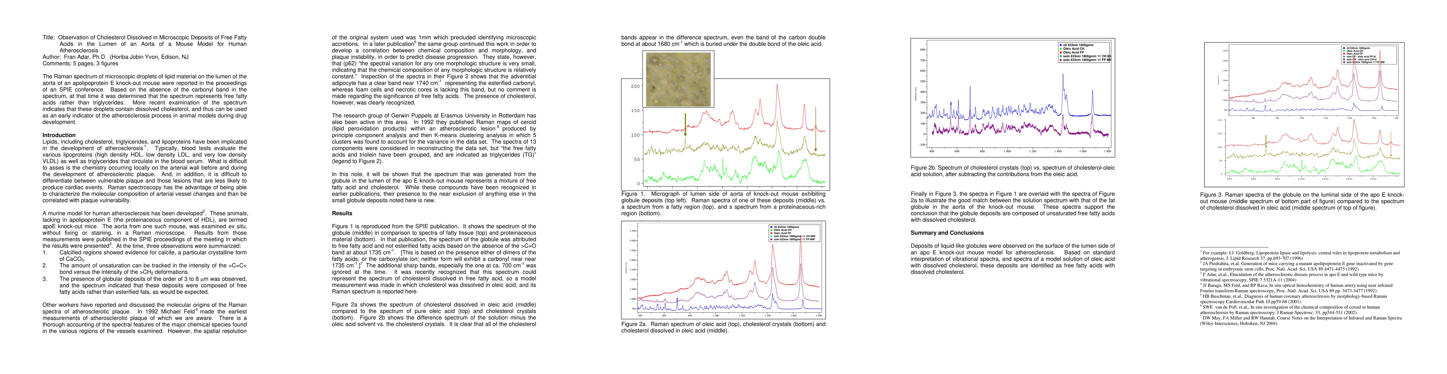 The Raman spectrum of microscopic droplets of lipid material on the lumen of the aorta of an apolipoprotein E knock-out mouse were reported in the proceedings of an SPIE conference. Based on the absence of the carbonyl band in the spectrum, at that time it was determined that the spectrum represents free fatty acids rather than triglycerides. More recent examination of the spectrum indicates that these droplets contain dissolved cholesterol, and thus can be used as an early indicator of the atherosclerosis process in animal models during drug development.