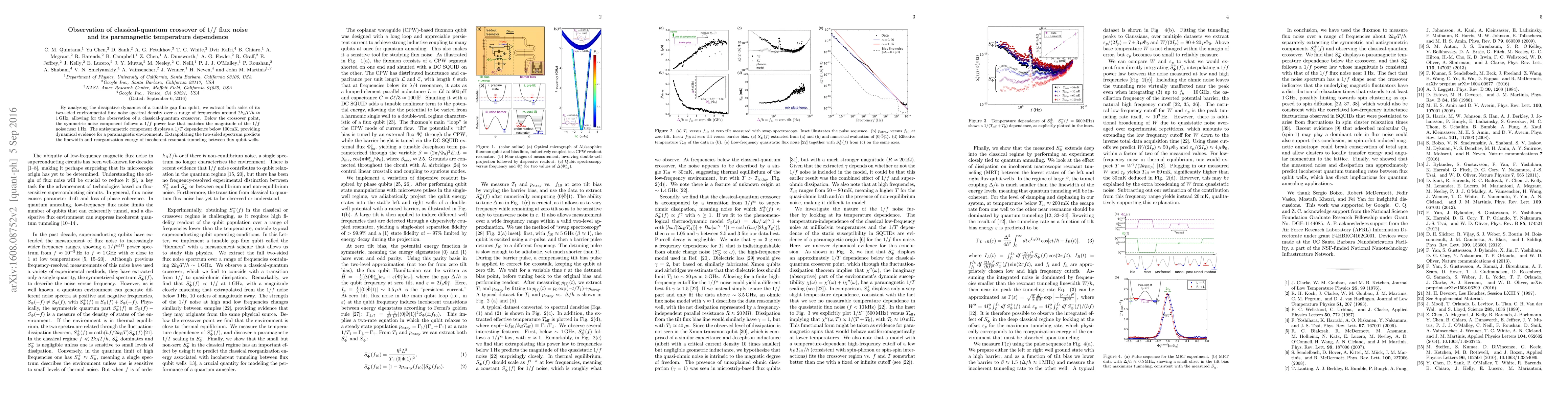 By analyzing the dissipative dynamics of a tunable gap flux qubit, we extract both sides of its two-sided environmental flux noise spectral density over a range of frequencies around $2k_BT/h \approx 1\,\rm{GHz}$, allowing for the observation of a classical-quantum crossover. Below the crossover point, the symmetric noise component follows a $1/f$ power law that matches the magnitude of the $1/f$ noise near $1\,{\rm{Hz}}$. The antisymmetric component displays a 1/T dependence below $100\,\rm{mK}$, providing dynamical evidence for a paramagnetic environment. Extrapolating the two-sided spectrum predicts the linewidth and reorganization energy of incoherent resonant tunneling between flux qubit wells.