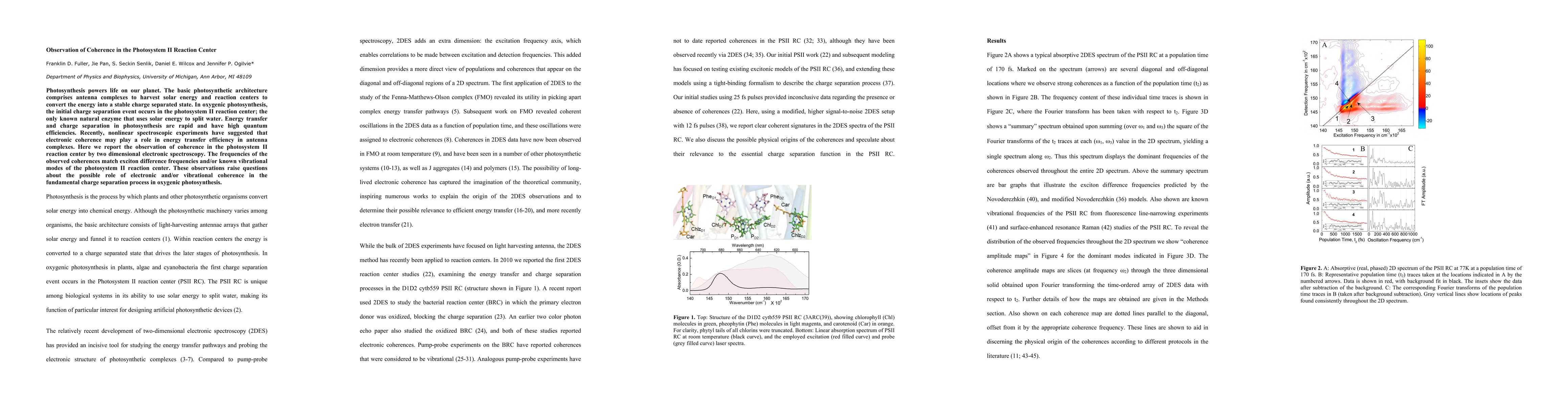 This paper reports the observation of coherence in the photosystem II reaction center using two-dimensional electronic spectroscopy, suggesting that electronic and vibrational coherence may influence the efficiency of energy transfer and charge separation in photosynthesis. The findings raise questions about the role of coherence in the fundamental processes of oxygenic photosynthesis.