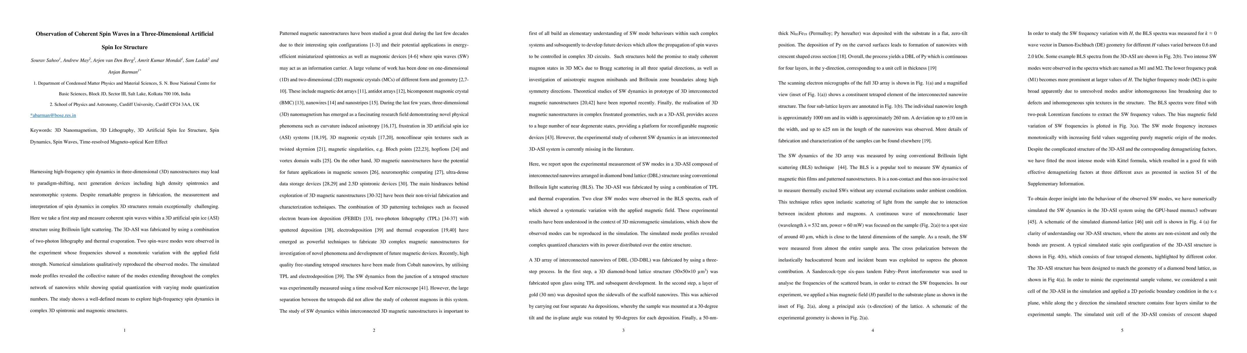 This paper reports the first observation of coherent spin waves in a three-dimensional artificial spin ice structure using Brillouin light scattering, revealing two spin-wave modes with frequency variations under applied fields. The study demonstrates a method to explore high-frequency spin dynamics in complex 3D nanostructures.