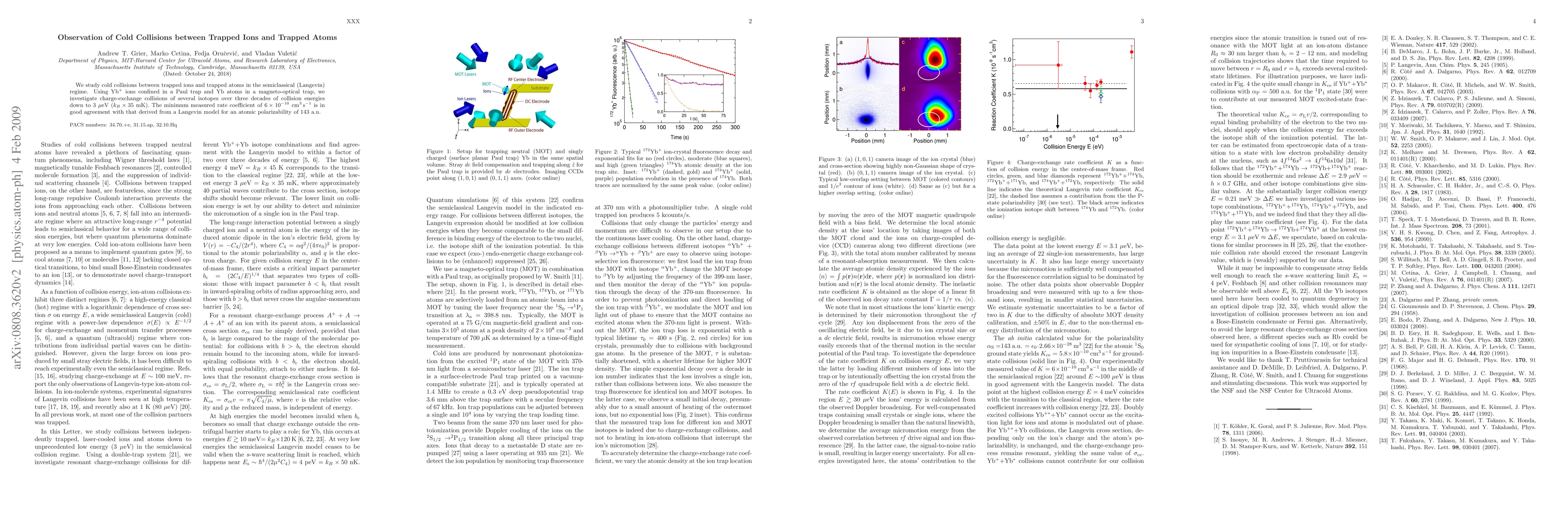 This paper reports on a double-trap system for studying cold collisions between trapped Yb$^+$ ions and Yb atoms, observing charge-exchange interactions at energies down to 400 neV. The measured constant collision rate coefficient of $6 \times 10^{-10}$ cm$^{3}$s$^{-1}$ aligns with predictions from a semiclassical Langevin model.