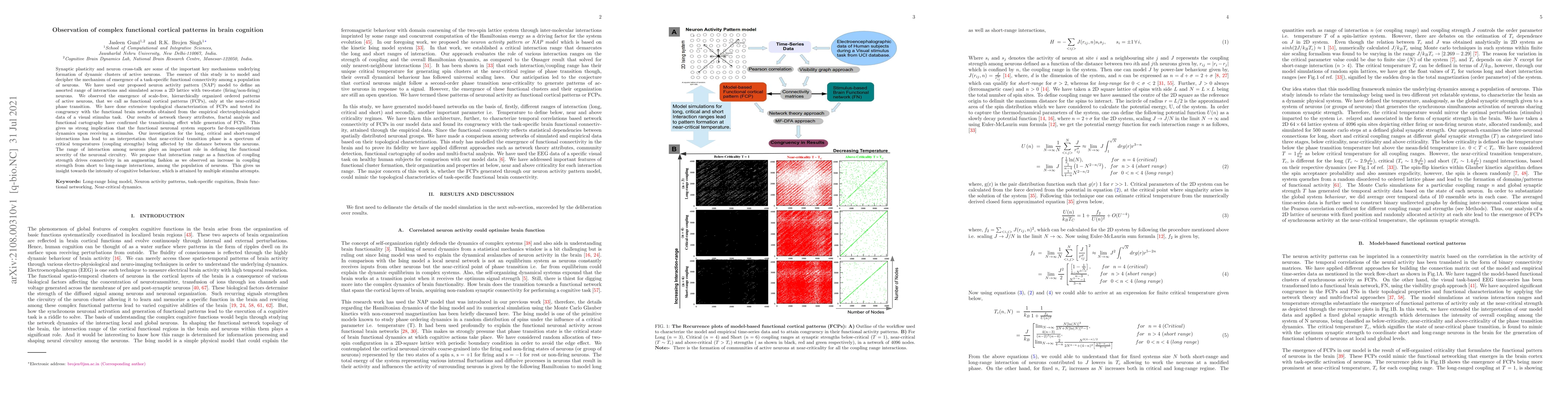 Synaptic plasticity and neuron cross-talk are some of the important key mechanisms underlying formation of dynamic clusters of active neurons. The essence of this study is to model and decipher the mechanism of emergence of a task-specific functional connectivity among a population of neurons. We have used our proposed neuron activity pattern (NAP) model to define an assorted range of interactions and simulated across a 2D lattice with two-state (firing/non-firing) neurons. We observed the emergence of scale-free, hierarchically organized ordered patterns of active neurons, that we call as functional cortical patterns (FCPs), only at the near-critical phase transition. We have done extensive topological characterization of FCPs and tested its congruency with the functional brain networks obtained from the empirical electrophysiological data of a visual stimulus task. Our results of network theory attributes, fractal analysis and functional cartography have confirmed the transitioning effect while generation of FCPs. This gives us strong implication that the functional neuronal system supports far-from-equilibrium dynamics upon receiving a stimulus. Our investigation for the long, critical and short-ranged interactions has lead to an interpretation that near-critical transition phase is a spectrum of critical temperatures (coupling strengths) being affected by the distance between the neurons. The range of interaction among neurons plays an important role in defining the functional severity of the neuronal circuitry. We propose that interaction range as a function of coupling strength drives connectivity in an augmenting fashion as we observed an increase in coupling strength from short to long-range interactions, among the population of neurons. This gives us insight towards the intensity of cognitive behaviour, which is attained by multiple stimulus attempts.