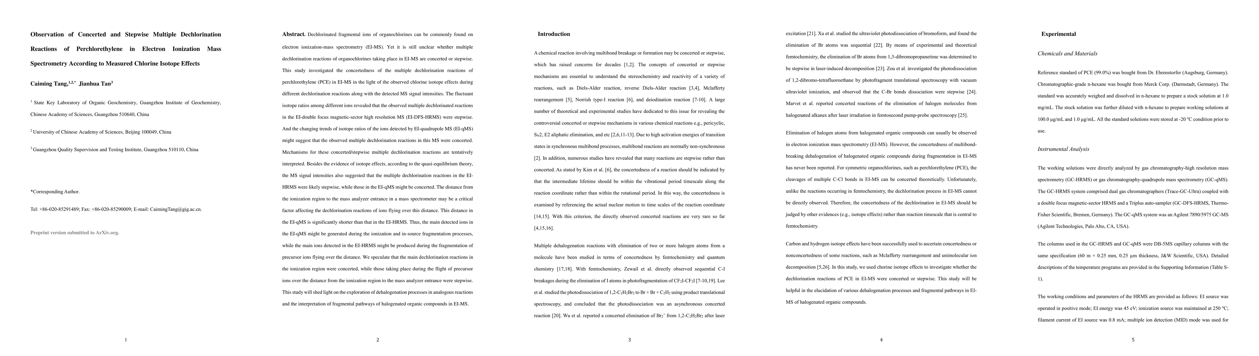 Researchers investigated the concertedness of multiple dechlorination reactions in electron ionization mass spectrometry (EI-MS) using chlorine isotope effects and signal intensities, finding that some reactions were stepwise while others were concerted, likely influenced by distance from the ionization region to the mass analyzer entrance.