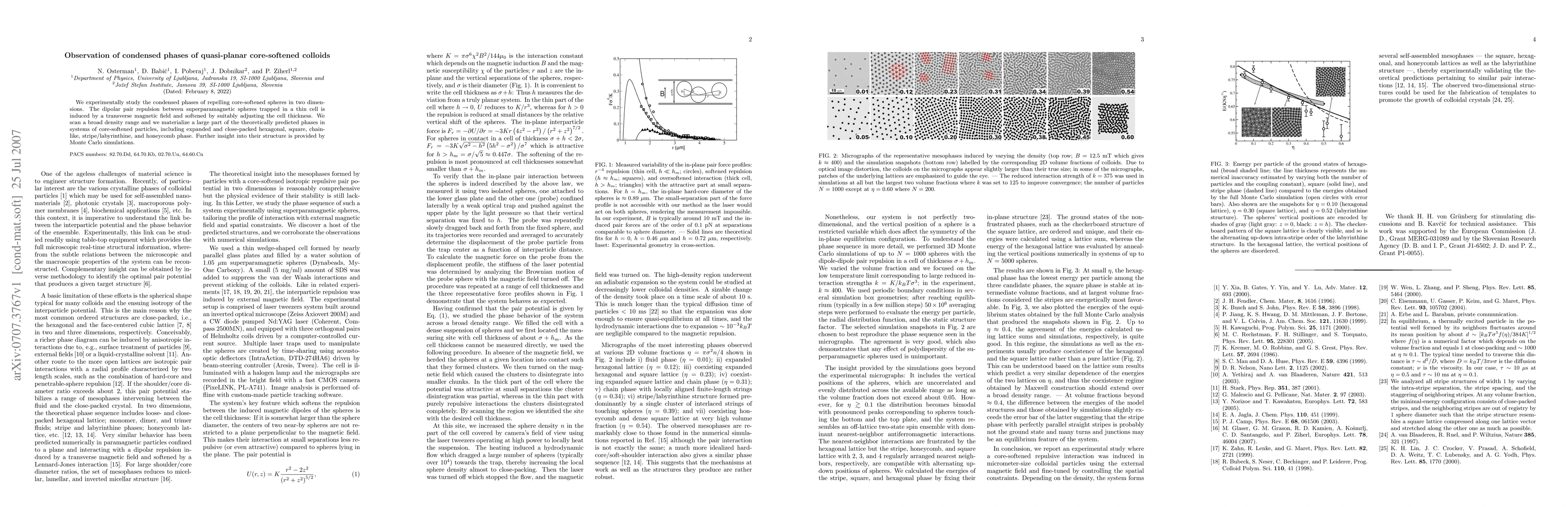 This paper experimentally investigates condensed phases of two-dimensional core-softened colloids, observing a variety of predicted phases including expanded, close-packed, and complex structures, validated by Monte Carlo simulations. The study employs a transverse magnetic field to induce dipolar repulsion and adjusts cell thickness to soften core interactions.