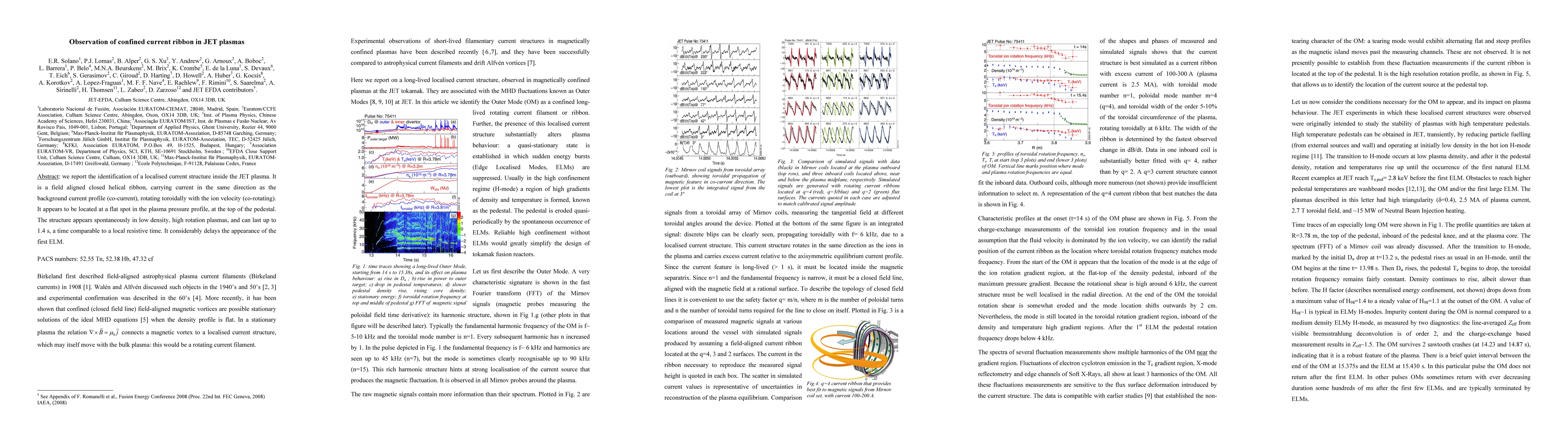 we report the identification of a localised current structure inside the JET plasma. It is a field aligned closed helical ribbon, carrying current in the same direction as the background current profile (co-current), rotating toroidally with the ion velocity (co-rotating). It appears to be located at a flat spot in the plasma pressure profile, at the top of the pedestal. The structure appears spontaneously in low density, high rotation plasmas, and can last up to 1.4 s, a time comparable to a local resistive time. It considerably delays the appearance of the first ELM.