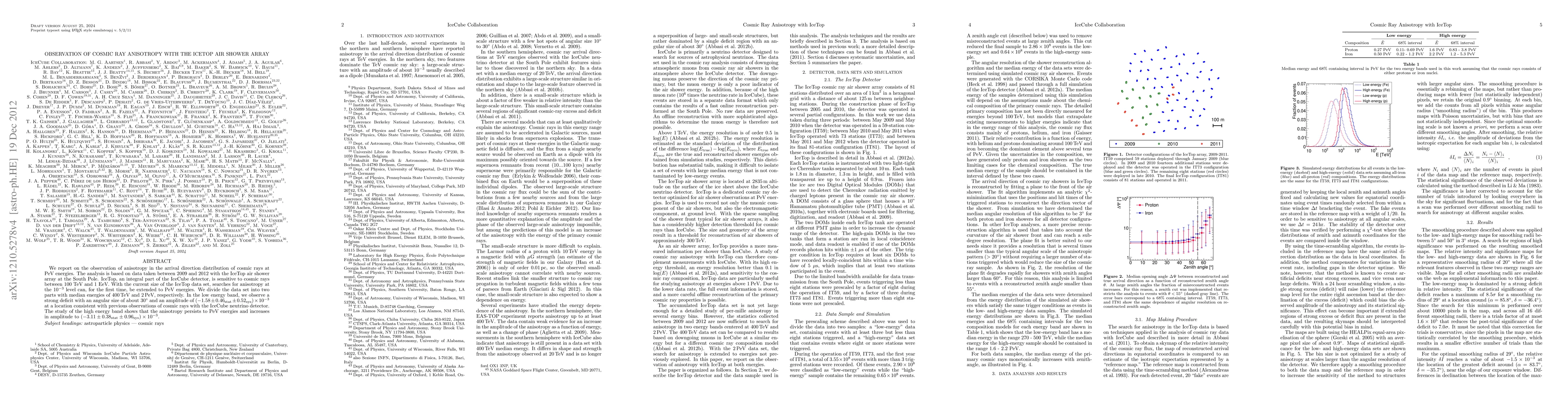 This study observes anisotropy in the arrival direction distribution of cosmic rays at PeV energies using the IceTop air shower array. The analysis reveals a strong anisotropy at lower energies and shows that this anisotropy persists and increases in amplitude at higher energies.