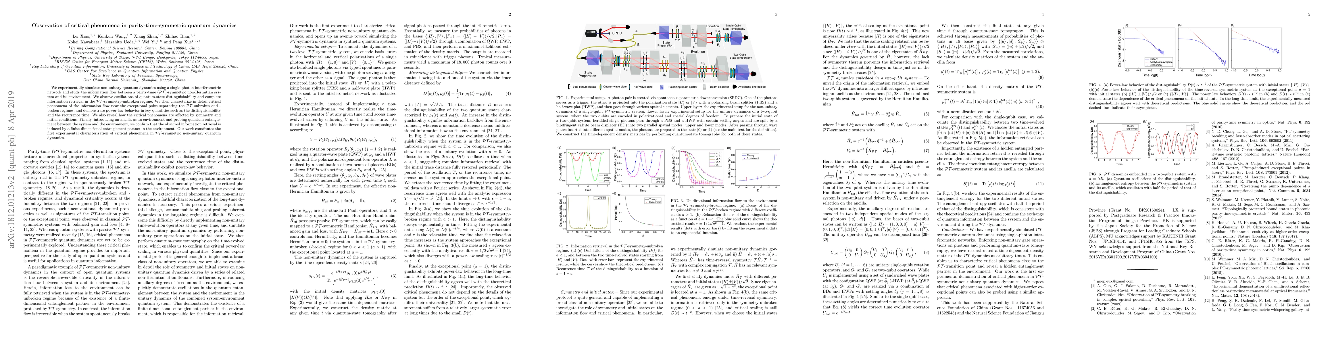 This paper experimentally investigates non-unitary quantum dynamics in a PT-symmetric system using a single-photon interferometric network, observing critical phenomena near the exceptional point and demonstrating power-law behavior in distinguishability and recurrence time. The study reveals the role of symmetry and initial conditions in these phenomena and confirms information retrieval via finite-dimensional entanglement with an environment ancilla.