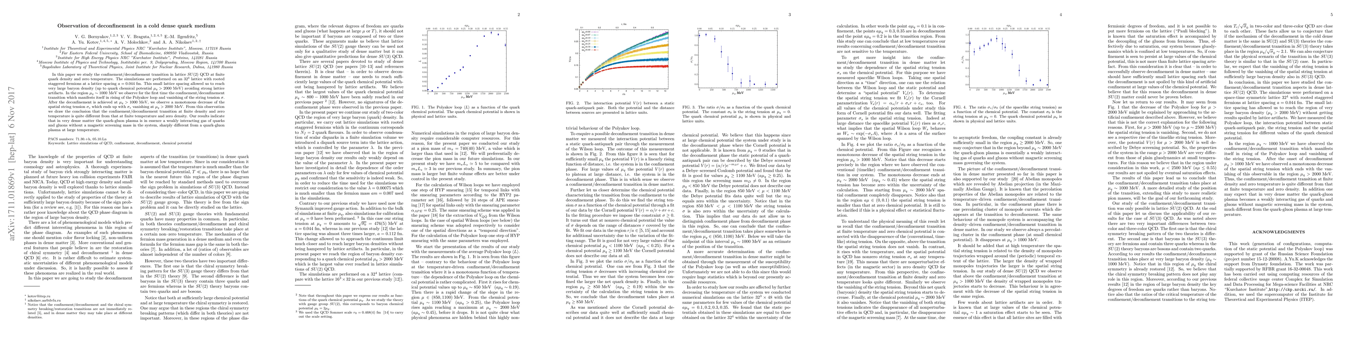 In this paper we study the confinement/deconfinement transition in lattice $SU(2)$ QCD at finite quark density and zero temperature. The simulations are performed on an $32^4$ lattice with rooted staggered fermions at a lattice spacing $a = 0.044 \mathrm{~fm}$. This small lattice spacing allowed us to reach very large baryon density (up to quark chemical potential $\mu_q > 2000 \mathrm{~MeV}$) avoiding strong lattice artifacts. In the region $\mu_q\sim 1000 \mathrm{~MeV}$ we observe for the first time the confinement/deconfinement transition which manifests itself in rising of the Polyakov loop and vanishing of the string tension $\sigma$. After the deconfinement is achieved at $\mu_q > 1000 \mathrm{~MeV}$, we observe a monotonous decrease of the spatial string tension $\sigma_s$ which ends up with $\sigma_s$ vanishing at $\mu_q > 2000 \mathrm{~MeV}$. From this observation we draw the conclusion that the confinement/deconfinement transition at finite density and zero temperature is quite different from that at finite temperature and zero density. Our results indicate that in very dense matter the quark-gluon plasma is in essence a weakly interacting gas of quarks and gluons without a magnetic screening mass in the system, sharply different from a quark-gluon plasma at large temperature.