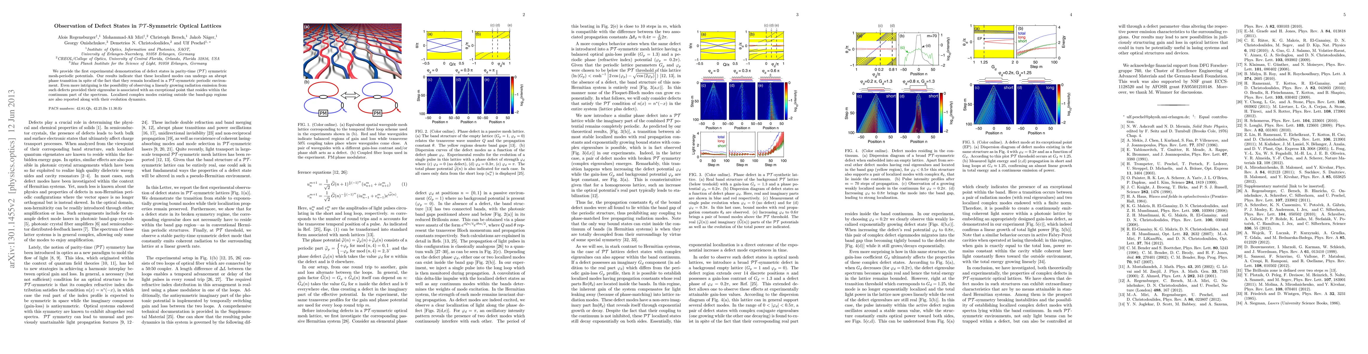 We provide the first experimental demonstration of defect states in parity-time (PT) symmetric mesh-periodic potentials. Our results indicate that these localized modes can undergo an abrupt phase transition in spite of the fact that they remain localized in a PT-symmetric periodic environment. Even more intriguing is the possibility of observing a linearly growing radiation emission from such defects provided their eigenvalue is associated with an exceptional point that resides within the continuum part of the spectrum. Localized complex modes existing outside the band-gap regions are also reported along with their evolution dynamics.