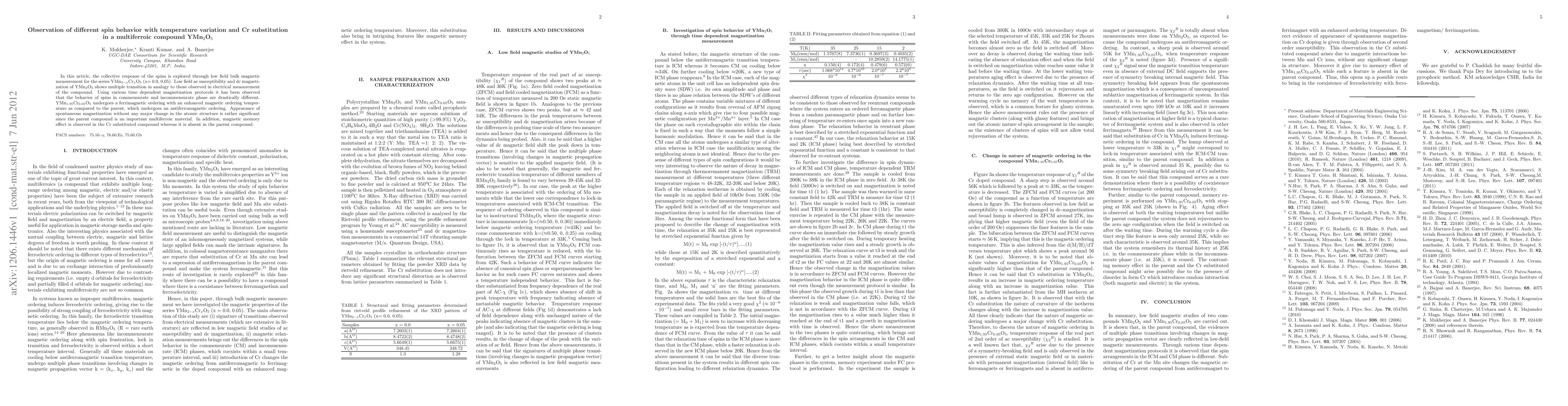 In this article, the collective response of the spins is explored through low field bulk magnetic measurement for the series YMn$_{2-x}$Cr$_x$O$_5$ (x= 0.0, 0.05). Low field ac susceptibility and dc magnetization of YMn$_2$O$_5$ shows multiple transition in analogy to those observed in electrical measurement of the compound. Using various time dependent magnetization protocols it has been observed that the behavior of spins in commensurate and incommensurate phase are drastically different. YMn$_{1.95}$Cr$_{0.05}$O$_5$ undergoes a ferrimagnetic ordering with an enhanced magnetic ordering temperature as compared to the parent, which undergoes an antiferromagnetic ordering. Appearance of spontaneous magnetization without any major change in the atomic structure is rather significant since the parent compound is an important multiferroic material. In addition, magnetic memory effect is observed in the Cr substituted compound whereas it is absent in the parent compound.