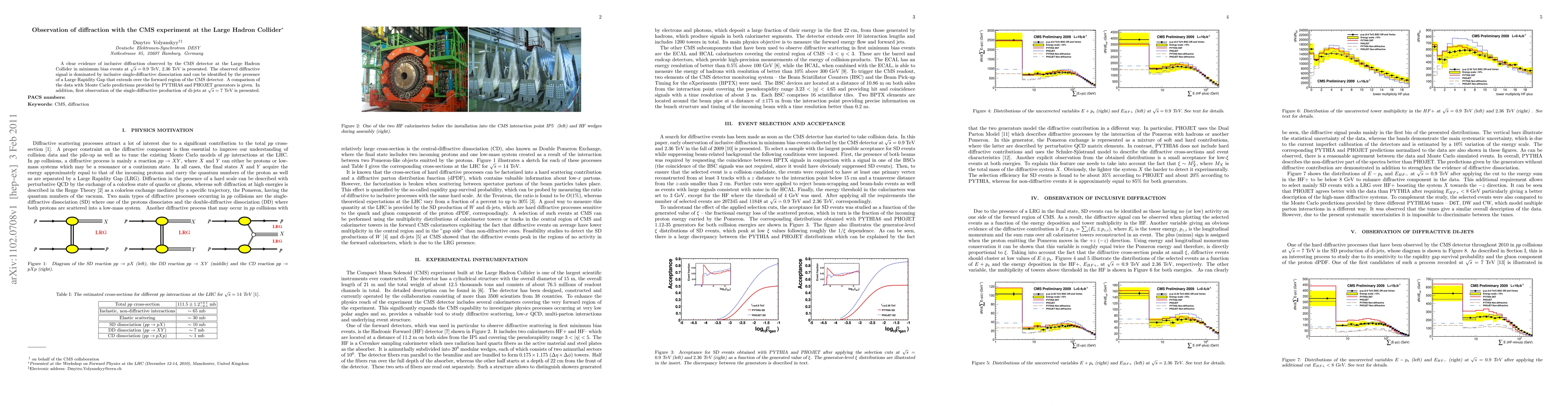 The CMS experiment at the Large Hadron Collider observed clear evidence of inclusive diffraction at energies of 0.9 TeV and 2.36 TeV, characterized by single-diffractive dissociation and a Large Rapidity Gap. Additionally, the first single-diffractive production of di-jets at 7 TeV was reported.