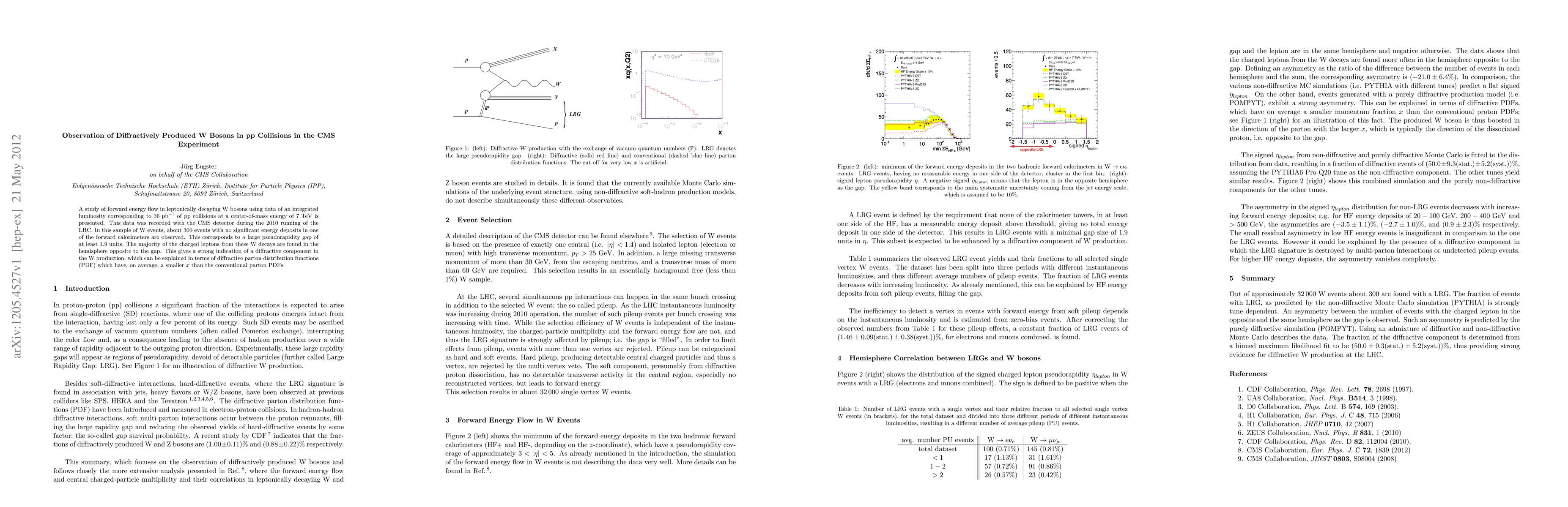A study of forward energy flow in leptonically decaying W bosons using data of an integrated luminosity corresponding to 36 pb-1 of pp collisions at a center-of-mass energy of 7 TeV is presented. This data was recorded with the CMS detector during the 2010 running of the LHC. In this sample of W events, about 300 events with no significant energy deposits in one of the forward calorimeters are observed. This corresponds to a large pseudorapidity gap of at least 1.9 units. The majority of the charged leptons from these W decays are found in the hemisphere opposite to the gap. This gives a strong indication of a diffractive component in the W production, which can be explained in terms of diffractive parton distribution functions (PDF) which have, on average, a smaller x than the conventional parton PDFs.
