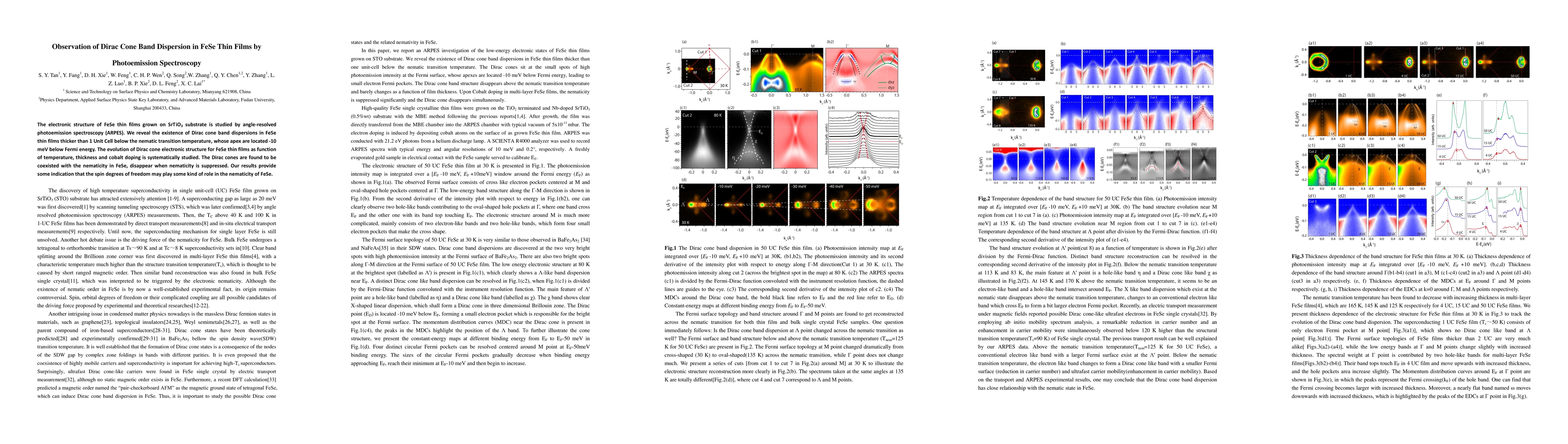 Research reveals the presence of Dirac cone band dispersions in FeSe thin films via ARPES, coexisting with nematicity and disappearing when nematicity is suppressed. The study suggests that spin degrees of freedom may influence nematicity in FeSe.