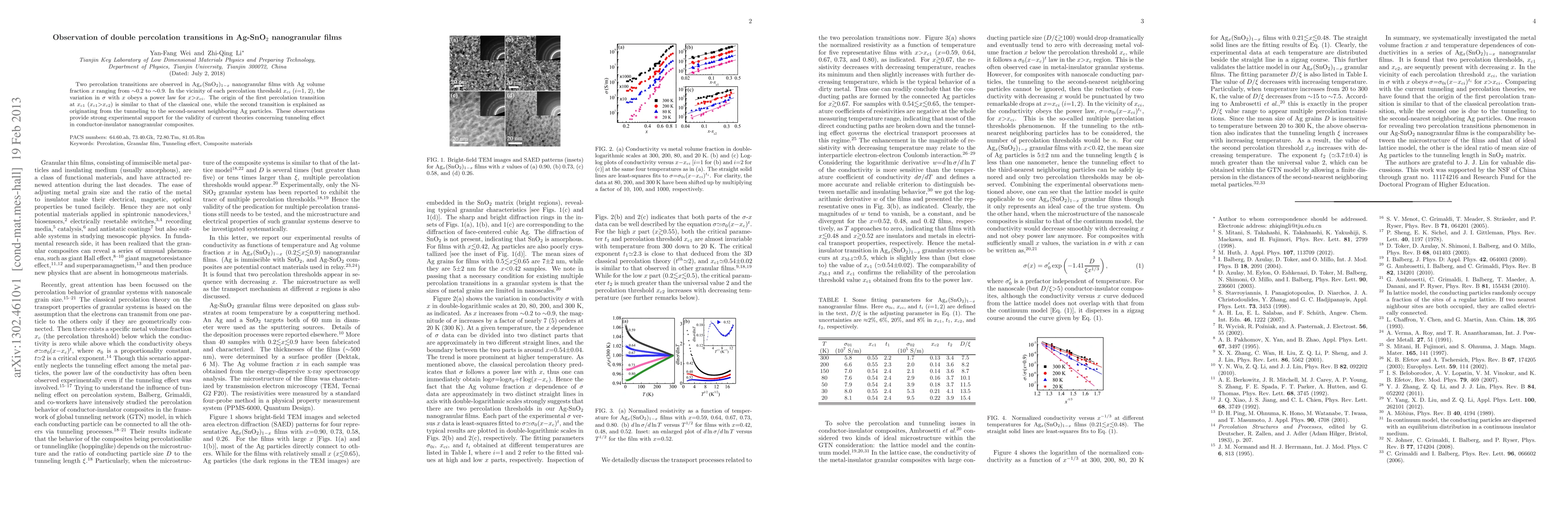 This paper observes two percolation transitions in Ag-SnO$_2$ nanogranular films, attributing the first to classical percolation and the second to tunneling effects between Ag particles. The findings validate current theories on tunneling in conductor-insulator composites.