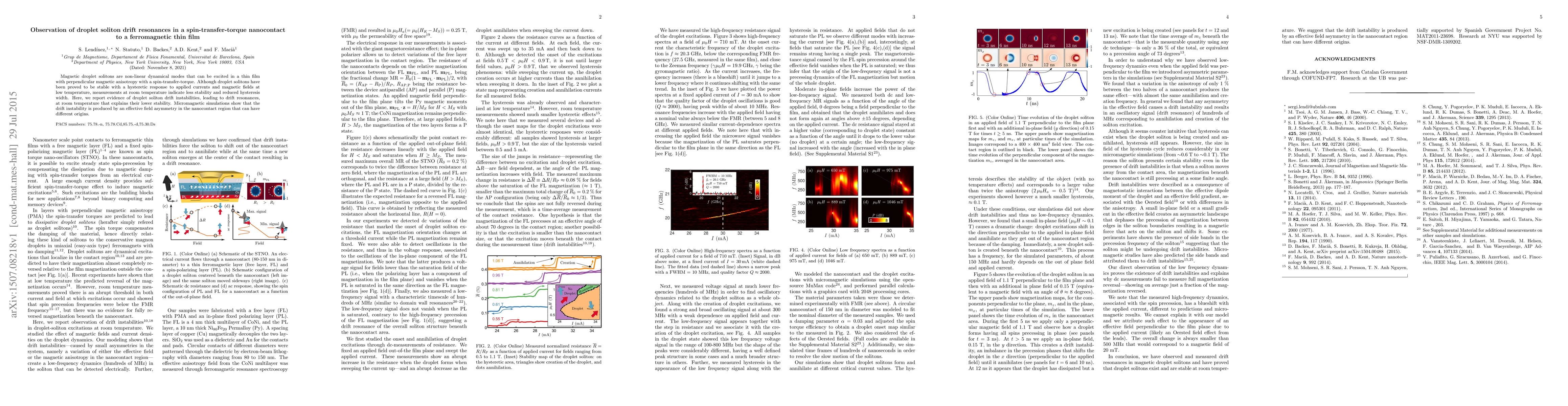 This paper observes droplet soliton drift instabilities at room temperature in a spin-transfer-torque nanocontact to a ferromagnetic thin film, explaining their reduced stability and hysteresis. Micromagnetic simulations reveal that the drift instability arises from an effective field asymmetry in the nanocontact region.