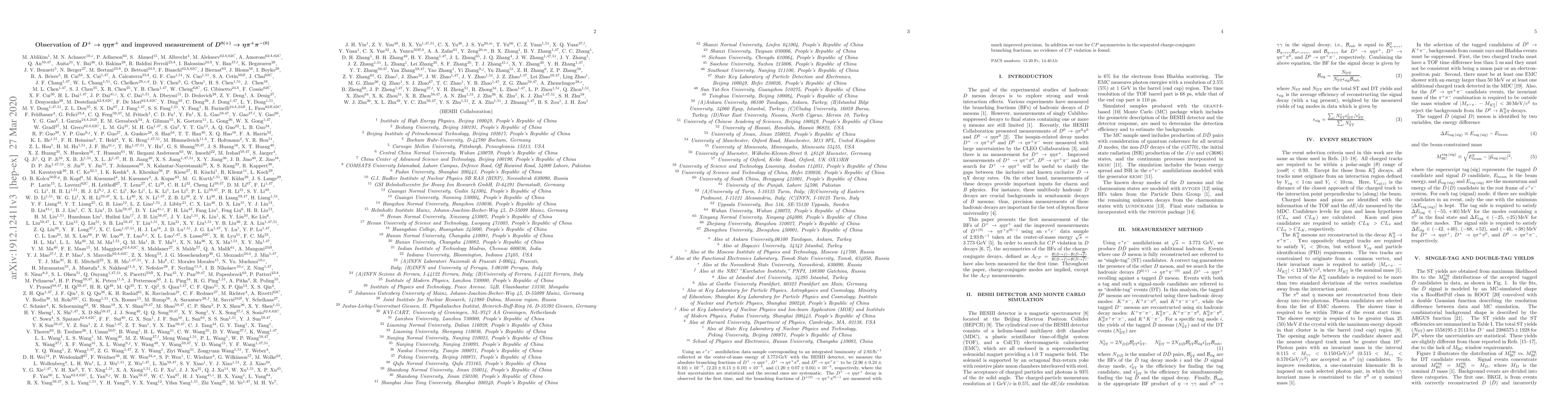 Using an $e^+e^-$ annihilation data sample corresponding to an integrated luminosity of $2.93\,\rm fb^{-1}$ collected at the center-of-mass energy of 3.773\,GeV with the BESIII detector, we measure the absolute branching fractions of $D^+\to\eta\eta\pi^+$, $D^+\to\eta\pi^+\pi^0$, and $D^0\to\eta\pi^+\pi^-$ to be $(2.96 \pm 0.24 \pm 0.13)\times 10^{-3}$, $(2.23 \pm 0.15 \pm 0.11)\times 10^{-3}$, and $(1.20 \pm 0.07 \pm 0.04)\times 10^{-3}$, respectively, where the first uncertainties are statistical and the second ones systematic. The $D^+\to\eta\eta\pi^+$ decay is observed for the first time and the branching fractions of $D^{+(0)}\to\eta\pi^+\pi^{0(-)}$ are measured with much improved precision. In addition we test for $CP$ asymmetries in the separated charge-conjugate branching fractions; no evidence of $CP$ violation is found.