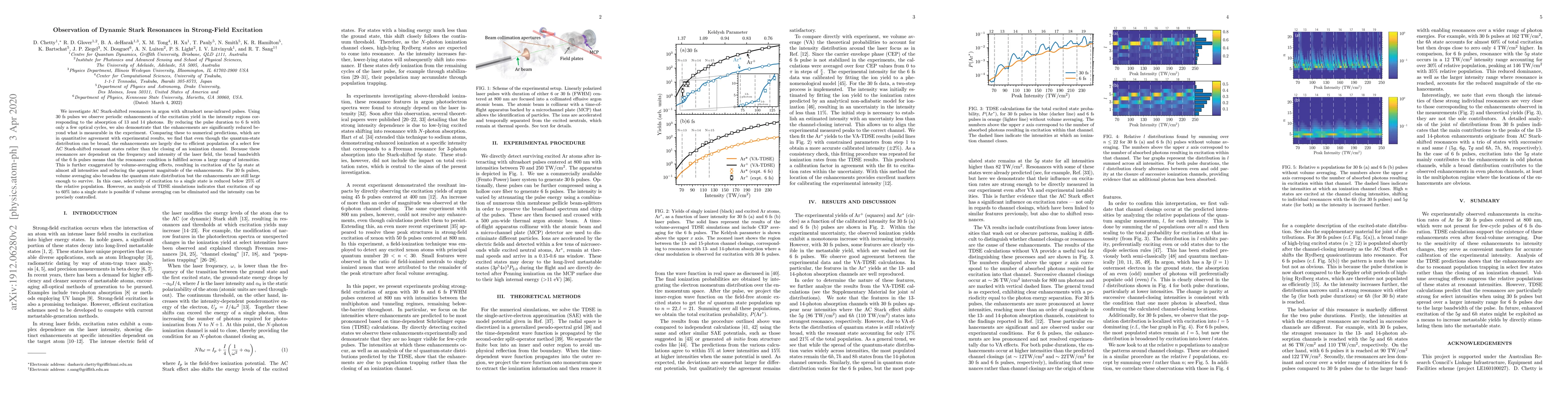 We investigate AC Stark-shifted resonances in argon with ultrashort near-infrared pulses. Using 30 fs pulses we observe periodic enhancements of the excitation yield in the intensity regions corresponding to the absorption of 13 and 14 photons. By reducing the pulse duration to 6 fs with only a few optical cycles, we also demonstrate that the enhancements are significantly reduced beyond what is measurable in the experiment. Comparing these to numerical predictions, which are in quantitative agreement with experimental results, we find that even though the quantum-state distribution can be broad, the enhancements are largely due to efficient population of a select few AC Stark-shifted resonant states rather than the closing of an ionization channel. Because these resonances are dependent on the frequency and intensity of the laser field, the broad bandwidth of the 6 fs pulses means that the resonance condition is fulfilled across a large range of intensities. This is further exaggerated by volume-averaging effects, resulting in excitation of the $5g$ state at almost all intensities and reducing the apparent magnitude of the enhancements. For 30 fs pulses, volume averaging also broadens the quantum state distribution but the enhancements are still large enough to survive. In this case, selectivity of excitation to a single state is reduced below 25% of the relative population. However, an analysis of TDSE simulations indicates that excitation of up to 60% into a single state is possible if volume averaging can be eliminated and the intensity can be precisely controlled.