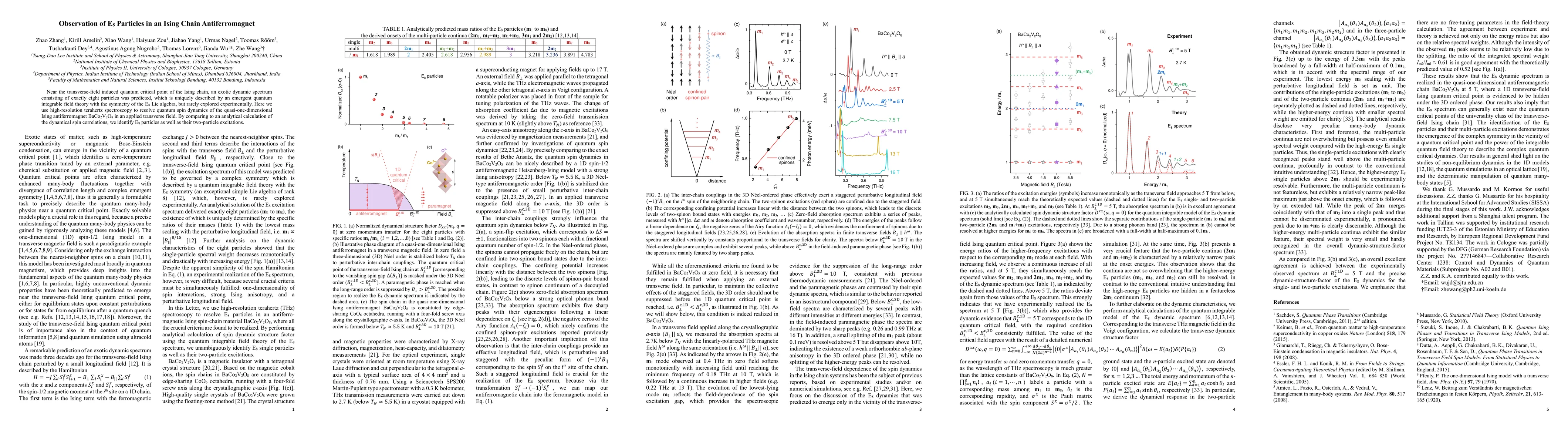 Near the transverse-field induced quantum critical point of the Ising chain, an exotic dynamic spectrum consisting of exactly eight particles was predicted, which is uniquely described by an emergent quantum integrable field theory with the symmetry of the $E_8$ Lie algebra, but rarely explored experimentally. Here we use high-resolution terahertz spectroscopy to resolve quantum spin dynamics of the quasi-one-dimensional Ising antiferromagnet BaCo$_2$V$_2$O$_8$ in an applied transverse field. By comparing to an analytical calculation of the dynamical spin correlations, we identify $E_8$ particles as well as their two-particle excitations.