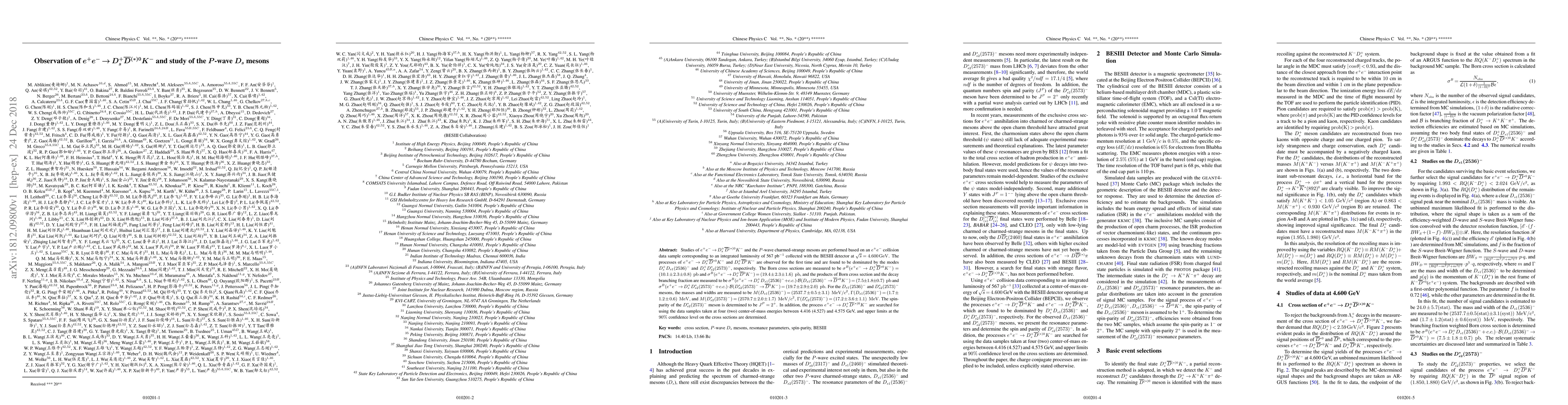 Researchers observed $e^+e^- ightarrow D_s^+ ar{D}{}^{(*)0} K^-$ for the first time, measuring cross-sections and decay branching fractions of related mesons, including the spin-parity of a previously unknown meson.