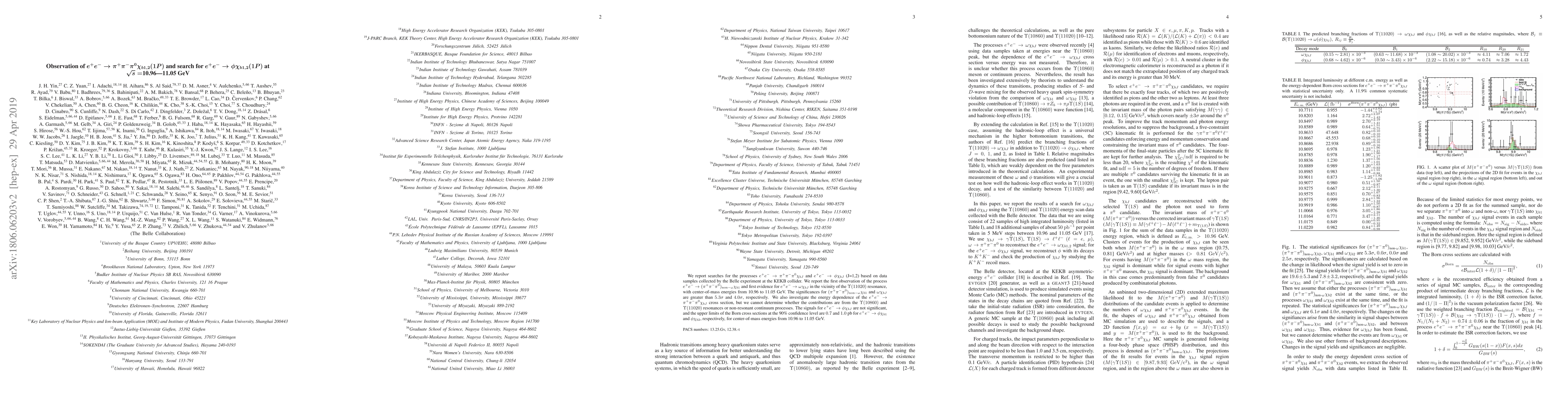 The Belle experiment at KEKB reports the first observation of $e^+e^-\to (\pi^+\pi^-\pi^0)_{\rm non-\omega}\chi_{b1}$ and first evidence for $e^+e^-\to\omega\chi_{bJ}$ near the $\Upsilon(11020)$ resonance, with significances above $5.3\sigma$ and $4.0\sigma$, respectively. No significant signals for $e^+e^-\to \phi\chi_{bJ}$ are found, with upper limits of 0.7 and 1.0 pb for $\chi_{b1}$ and $\chi_{b2}$, respectively.