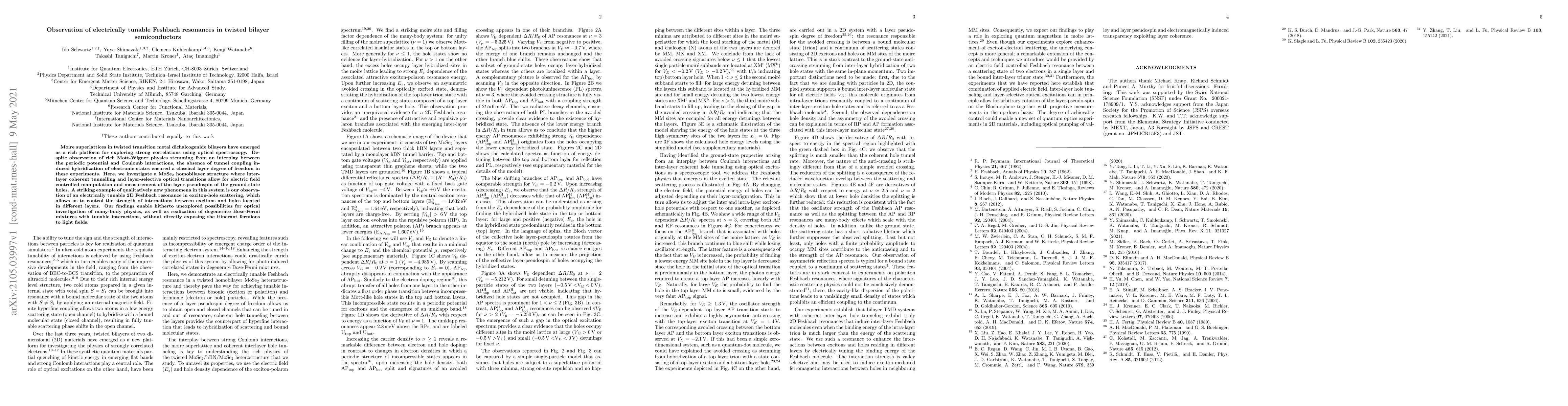Moire superlattices in twisted transition metal dichalcogenide bilayers have emerged as a rich platform for exploring strong correlations using optical spectroscopy. Despite observation of rich Mott-Wigner physics stemming from an interplay between the periodic potential and Coulomb interactions, the absence of tunnel coupling induced hybridization of electronic states ensured a classical layer degree of freedom in these experiments. Here, we investigate a MoSe$_2$ homobilayer structure where inter-layer coherent tunnelling and layer-selective optical transitions allow for electric field controlled manipulation and measurement of the layer-pseudospin of the ground-state holes. A striking example of qualitatively new phenomena in this system is our observation of an electrically tunable 2D Feshbach resonance in exciton-hole scattering, which allows us to control the strength of interactions between excitons and holes located in different layers. Our findings enable hitherto unexplored possibilities for optical investigation of many-body physics, as well as realization of degenerate Bose-Fermi mixtures with tunable interactions, without directly exposing the itinerant fermions to light fields.