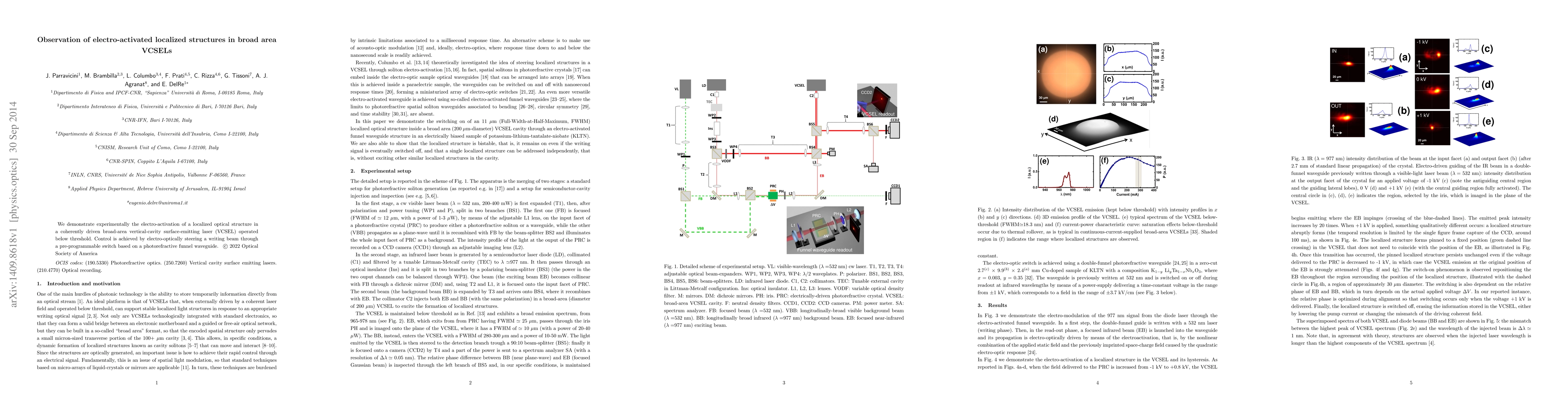 Summary: The paper reports on the first experimental observation of electro-activated localized optical structures in broad-area vertical-cavity surface-emitting lasers (VCSELs) operated below threshold, achieved through electro-optical steering using a photorefractive funnel waveguide. This method enables precise control over the optical structure.