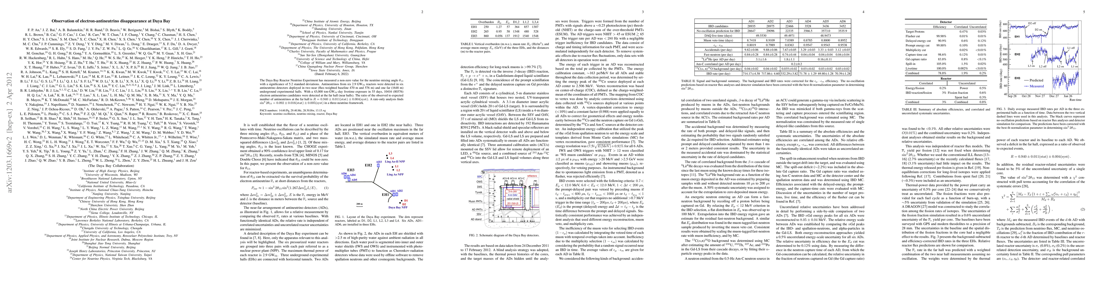 The Daya Bay Reactor Neutrino Experiment detected a significant disappearance of electron antineutrinos, confirming a non-zero value for the neutrino mixing angle $\theta_{13}$ at 5.2 standard deviations. This observation supports the three-neutrino framework with $\sin^22\theta_{13}=0.092\pm 0.016$.