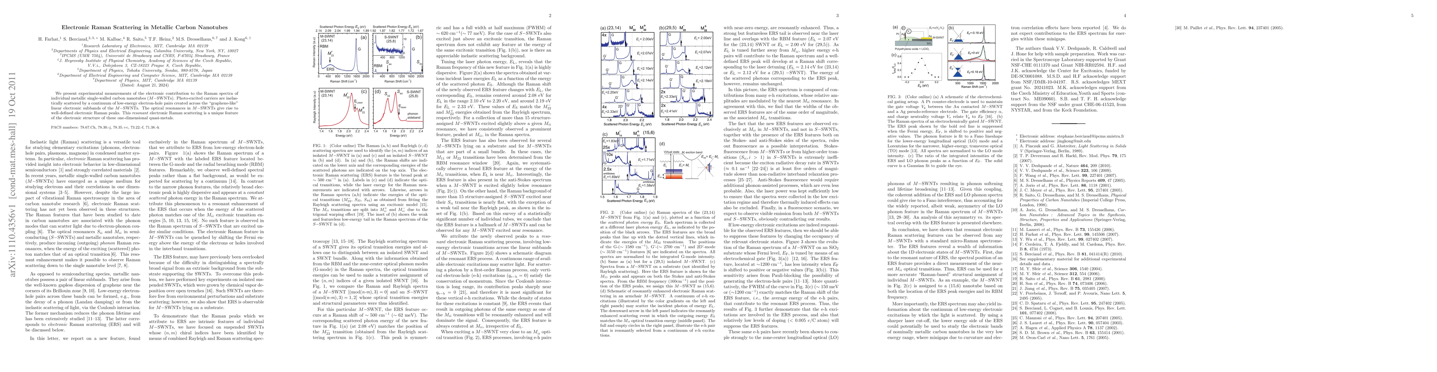 We present experimental measurements of the electronic contribution to the Raman spectra of individual metallic single-walled carbon nanotubes (MSWNTs). Photoexcited carriers are inelastically scattered by a continuum of low-energy electron-hole pairs created across the graphenelike linear electronic subbands of the MSWNTs. The optical resonances in MSWNTs give rise to well-defined electronic Raman peaks. This resonant electronic Raman scattering is a unique feature of the electronic structure of these one-dimensional quasimetals.